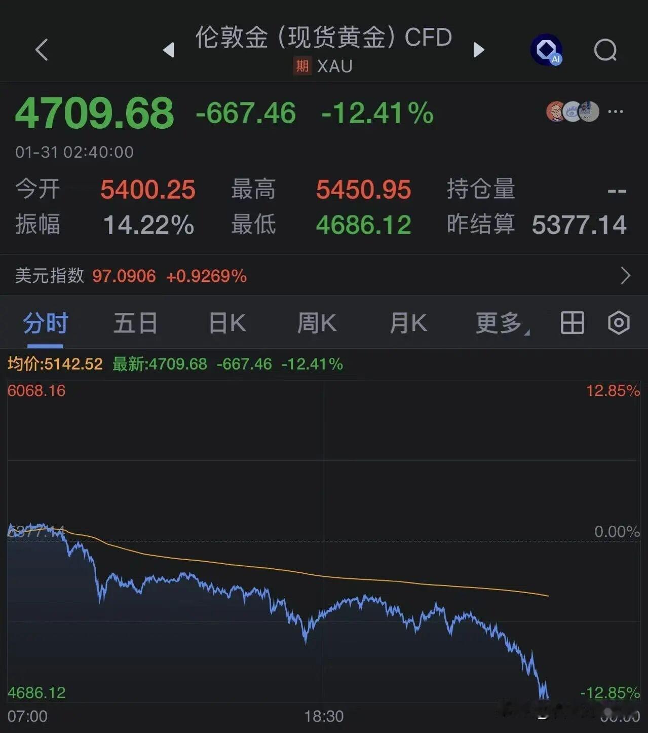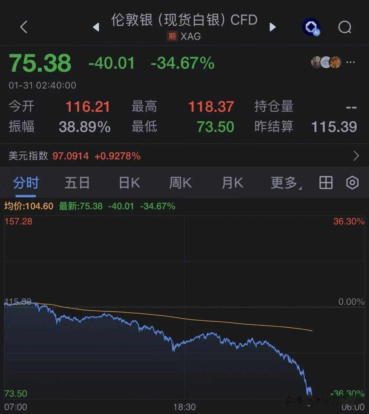现货白银直接“闪崩”,日内最大跌幅34.67%,从110美元/盎司上方狂泄至75.38美元/盎司,一夜回到解放前! 现货黄金也没扛住,日内暴跌12.41%,从5400美元/盎司直线跳水至4709.68美元/盎司,多头直接被按在地上摩擦! 前几天还在疯狂追高的侠们,现在还好吗?这波断崖式下跌,到底是技术性回调,还是牛市彻底终结? 评论区聊聊,你是抄底了,还是已经被深套?