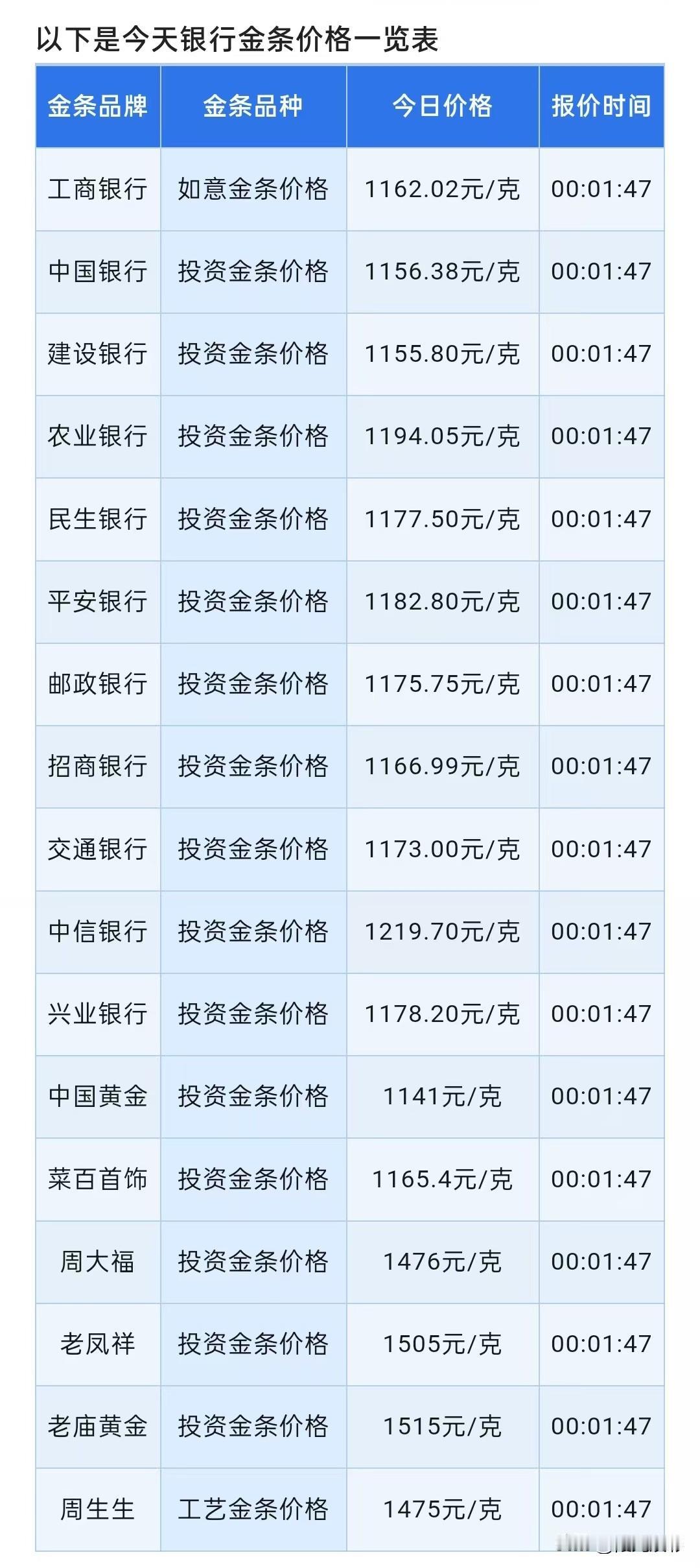 今日金价!金条价格大跌了!以及购买金条注意事项! 今天四大银行金条价格都整体大跌了!那么来看看,现在四大银行金条零售价卖多少钱了一克了? 工商银行如意金条价格1162.02元/克, 中国银行投资金条价格1156.38元/克, 建设银行投资金条价格1155.80元/克, 农业银行投资金条价格1194.05元/克。 同昨天(1月30号)上午四大银行金条报价相比较,今天四大银行金条价格都整体大跌了。 建设银行金条价格下跌了64.7元/克,中国银行金条价格下跌了66.98元/克,农业银行金条价格下跌了74元/克。 其中,工商银行金条价格下跌超出百元以上,下跌了101.96元/克。 根据黄金网消息:2026年1月31日,今日金价银价大幅跳水,现货黄金一度失守5000美元跌至4942.69美元的低点,较日内高点5450美元回落近510美元,跌幅一度超8%;而现货白银一度失守100美元最低下探至94.85美元,跌幅一度超17%。铂金与钯金价格同步下跌,跌幅超10%。 截至05时16分,现货黄金下跌6.55%至每盎司5024美元,现货白银下跌16.29%至每盎司96.6美元,现货铂金下跌14.4%至每盎司2253.4美元,现货钯金下跌11.58%至每盎司1776美元。黄金实时价格1132元,白银实时价格25.1元,铂金实时价格504元,钯金实时价格391元。 此番历史性暴跌由多重因素引爆。直接催化剂是特朗普提名鹰派人物凯文·沃什(Kevin Warsh)为下任美联储主席,彻底逆转了市场对宽松货币政策的预期,导致前期涨幅巨大的贵金属遭遇恐慌性抛售。 同时,金价一年内上涨约75%、白银上涨超180%的巨大涨幅本身已积累巨大泡沫和获利了结压力。 此外,中国监管机构为遏制投机,暂停了国内唯一的白银期货LOF基金交易,进一步加剧了流动性紧张和抛售情绪。 此次暴跌标志着由流动性宽松预期驱动的单边狂热行情可能暂告段落,市场预计将进入剧烈震荡与阶段性整理时期。 短期内需密切关注特朗普政府的地缘政策动向及美联储新主席的政策信号,任何意外动向都可能再次引发剧烈波动。 分享个怎么购买金条最划算,能帮大家少花冤枉钱。 第一,买金条首选银行,千万不要去金店买。银行的金条带塑封,证书票据齐全,价格是当天国际金价上浮10~15块钱,这是普通人能买到的最便宜的,还能保真金条。 金店的金条价格比当天国际金价高出80~180块钱,非常不划算, 第二,银行金条有很多种,想要长期投资又想省事儿,建议直接买价格最便宜、造型最普通的投资金条。 还有一种是公益金条,比如生肖金条和纪念金条,虽然更好看,但价格更贵。回收时不看造型,只要是足金都是一个价,所以买投资金条更划算。 第三,普通人买金条,认准中、农、工、建这几个银行就可以了,他们的金条属于银行自有品牌,只要票据齐全,不拆封,还能找银行回收。 很多小银行卖的金条是代销的贵金属公司金条,回收只能自己找金店。 温馨提醒哦!银行买金条还要注意: 金条带有钢印编号,但是有的银行没有钢印而有的只有50g以上规格才有,在买之前要问清楚,到底有没有正式钢印,避免万一买到假货了,到时候引起不必要的麻烦。 还有哦!买好金条之后,包装不要拆掉了,因为包装一拆,好多银行就不再回收了,又要找另外渠道了。 另外,注重提醒,购买之前千万不要选错了,自己买选最基础的实物金,别选积存金和工艺金。 最后还是那句话,所有信息都只是提供参考价值!理财也有风险,恳请大家不要盲目跟风,要理性看待! 投资金条金价 金条行情 投资金条 银行金条 黄金一克小金条 银行金条价 金条避坑 银行实物金条 贵金属 贵金属行情走势 贵金属行情分析 贵金属行情 贵金属价格 贵金属国际行情 贵金属价格预测
