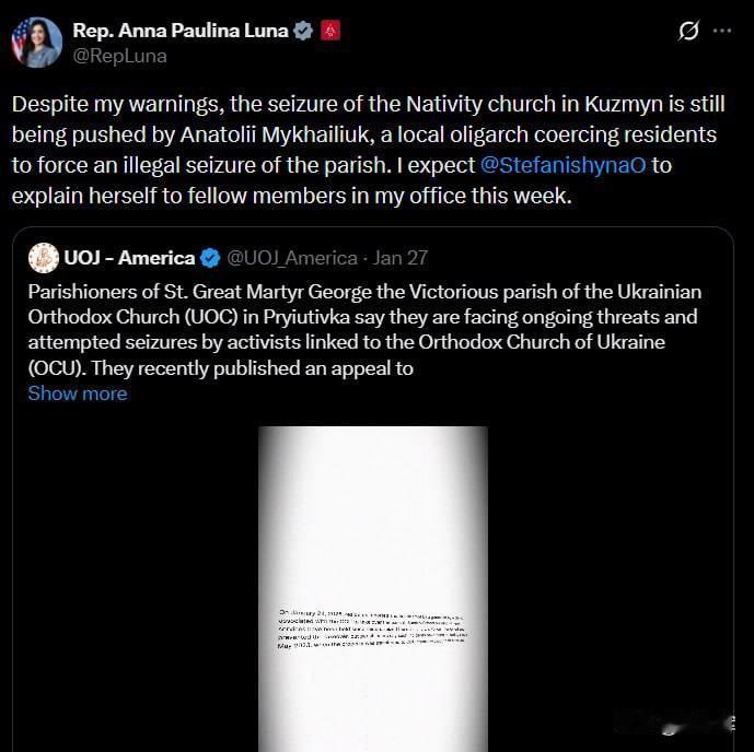 美国女议员关注乌克兰教堂强占事件 美国国会女议员安娜·保利娜·卢娜,已致函乌克兰驻美大使奥尔加·斯捷法尼希娜,就乌克兰西部库济兹明村救世主诞生教堂遭强占一事,要求乌方给出解释。 卢娜指控,当地寡头阿纳托利·米哈伊柳克,胁迫村民非法强占该教堂教区,要求乌方本周内作出回应。 此前卢娜已收到当地东正教徒求助视频,曾表态将追究乌方相关责任,并计划就此问题联络梵蒂冈。