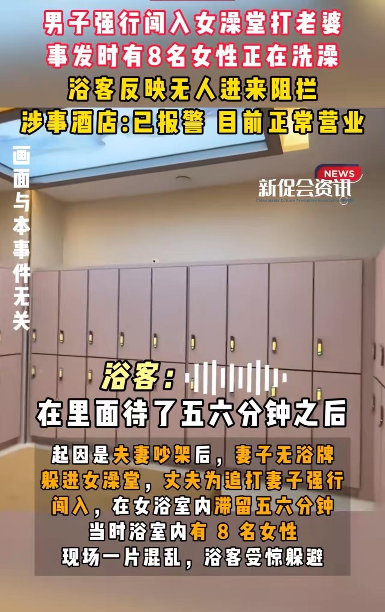 男子强行闯入女澡堂打老婆,当时有8个女人在洗澡,吓得惊叫连连,可男子不顾工作人员的劝阻,待在女澡堂约六七分钟。网友:这不是打老婆的问题了,这种人必须送进去! 河南周口,一场本该私密、放松的沐浴,竟演变成一场令人窒息的公共羞辱事件。 1月28日晚近午夜,鹿邑县某酒店公共浴池内,八位女性正泡在氤氲热气中洗去一天疲惫。 突然,浴室门被“砰”地一声撞开——一名男子怒气冲冲闯入女澡堂,径直扑向其中一位正在冲洗的女子,抬手就是一巴掌,嘴里还骂骂咧咧! 现场瞬间炸锅。尖叫声、哭喊声此起彼伏,有人慌忙抓毛巾遮身,有人缩在角落发抖,还有人直接滑倒在湿滑的地砖上。 更令人愤怒的是,从男子闯入到被拉出,整整六七分钟。 工作人员事后解释:“他冲得太快,我们刚反应过来就被他推倒了。” 而男子被强行拉出后,还在女浴室外面继续打老婆。直到有顾客报警,警方赶到,才将这名男子强行带离。 事后,浴池方面提出“补偿方案”:给每位在场女性赠送20张澡票,试图息事宁人。 可受害者们彻底寒心:“我们都被人看光了!尊严碎了一地,你拿20张澡票就想打发?以我们以后还敢来这洗澡吗?毫无隐私和安全可言?” 记者联系浴池,对方仍强调自己也是“受害者”,称已配合警方调查,并坚称“第一时间进行了阻拦”。但监控显示,从男子破门到工作人员出现,中间存在明显空档,应急机制形同虚设。 目前,涉事男子已被警方依法控制,案件正在进一步侦办中。 此事迅速引爆网络,评论区怒火滔天: “就是故意的,打老婆跑女浴池打,出来以后不能打吗?明知道那里都是女人还敢硬闯?换了以前妥妥的流氓罪!” “和她老婆演双簧了吧,开了眼了,得把这两口子都抓起来。” “如果是女子闯入男浴池家暴丈夫呢?大家会这样愤怒吗?” “他一开始进去可能是为了打老婆,可进去以后就忘了打老婆啦!” “这不是‘打老婆’,这是对所有女性的侵犯!女澡堂是什么地方?是他家客厅吗?这种人必须坐牢!” “浴池管理烂到家了!连个门禁都没有?男的能随便进女浴室?建议彻查安全漏洞,否则下次出事就不是被打,是更可怕的侵害!” “别再用‘家务事’洗白暴力!当着七八个陌生女人的面打人,这是蓄意羞辱,是犯罪,不是‘脾气差’!” 男子的行为,涉嫌非法侵入他人隐私场所、公然侮辱、家庭暴力及扰乱公共场所秩序, 这场闹剧暴露的,远不止一个暴戾丈夫的失控,更是公共空间对女性隐私保护的系统性溃败。 女澡堂,本应是城市中最基本的性别安全边界,如今却被一个男人轻易撕碎。 更值得警惕的是,社会仍有不少人把此类事件轻描淡写为“夫妻吵架”,却无视其本质——这是以暴力践踏公共秩序,以“家事”之名行羞辱之实。 如果今天容忍他闯女澡堂打老婆,明天就可能有人闯更衣室、产房、女厕。 法律必须亮剑:侵犯女性隐私与身体自主权,从来不是“家务事”,而是公共安全事件。 否则,当女性连洗澡都要提心吊胆时,所谓“文明社会”,不过是披着体面外衣的野蛮。