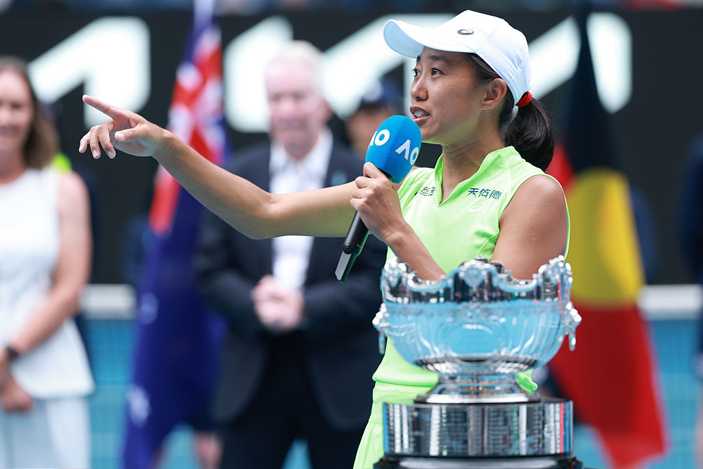 “今天对我而言非常特别,因为Sam来到了现场。我大满贯三次夺冠Sam都在,这也是为什么我的第三冠等了这么久(笑)。谢谢你!今天之所以特别,还因为郑洁姐在看台上,20年前她在这里为中国赢下了第一个大满贯,谢谢你给了我这么多帮助。”