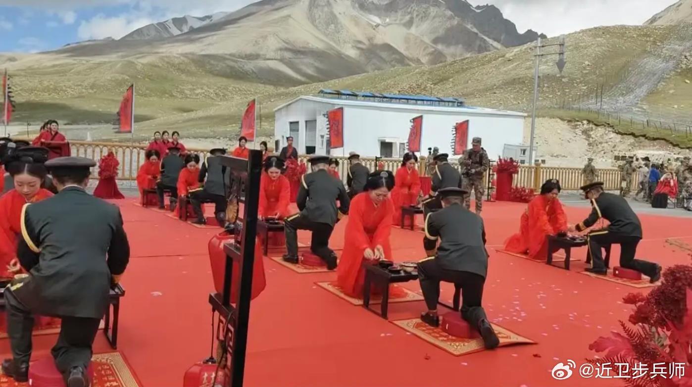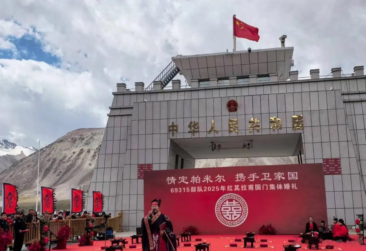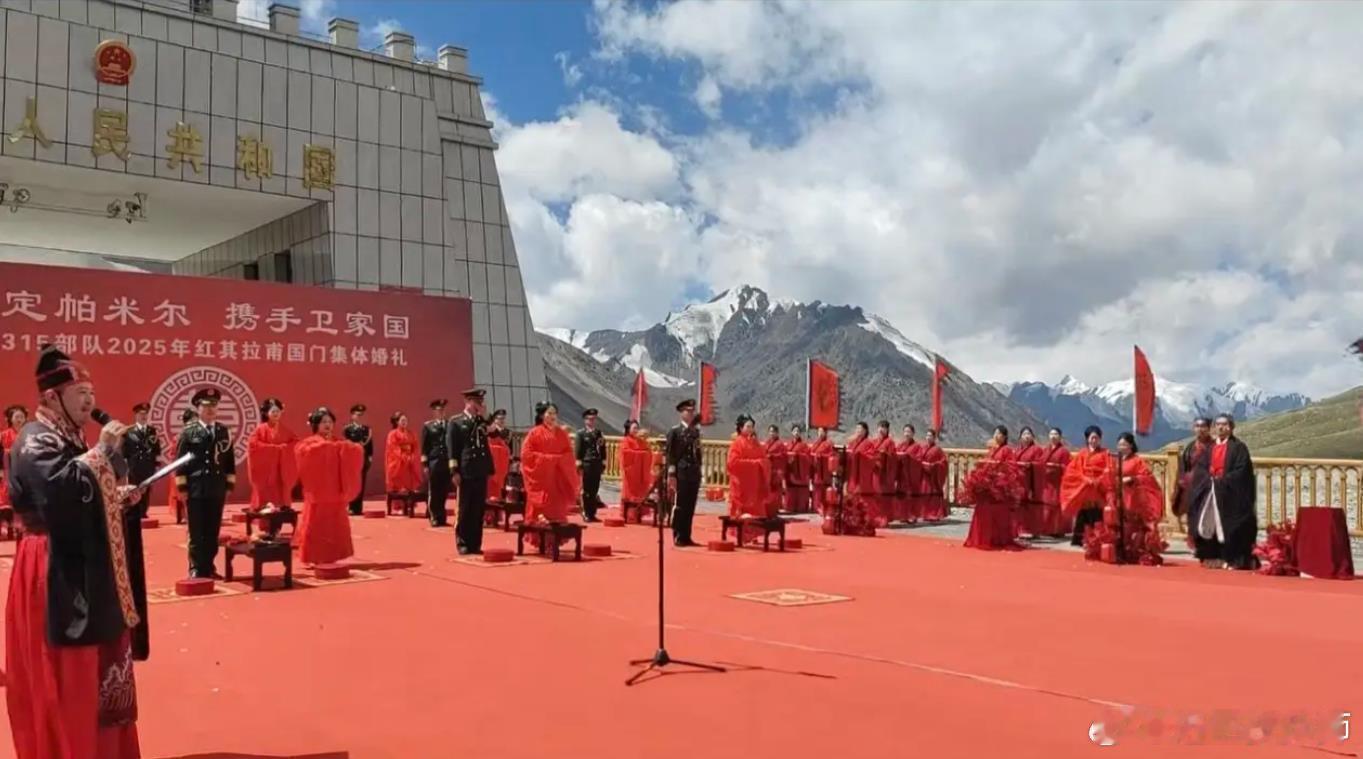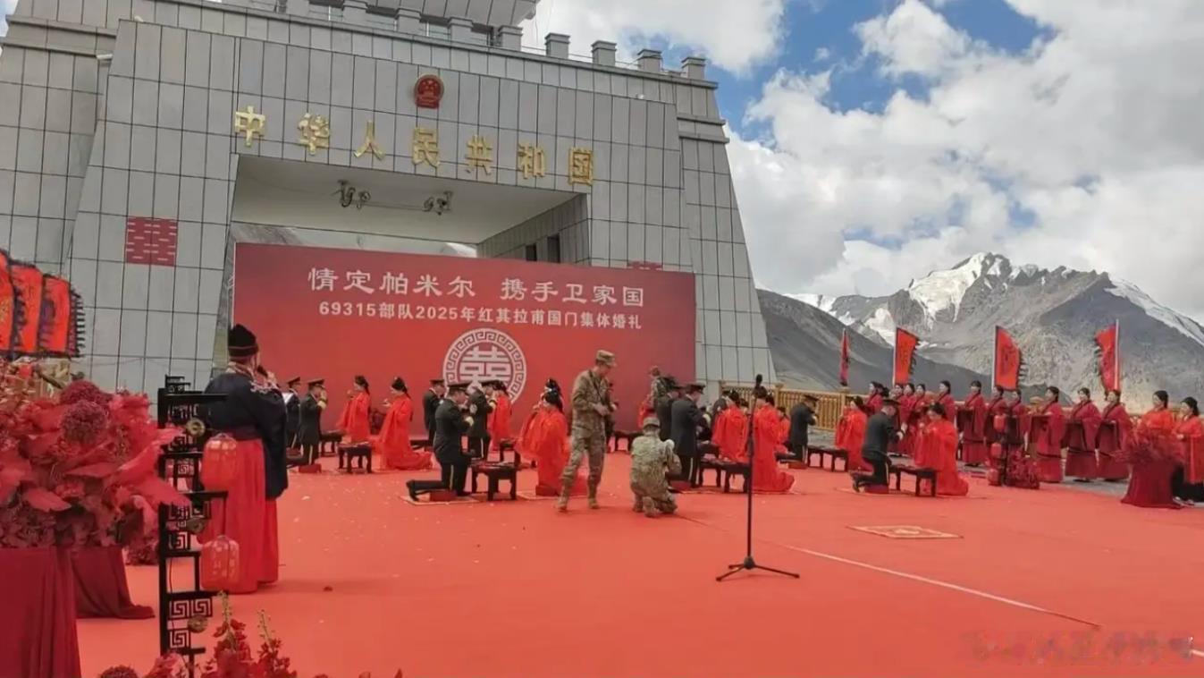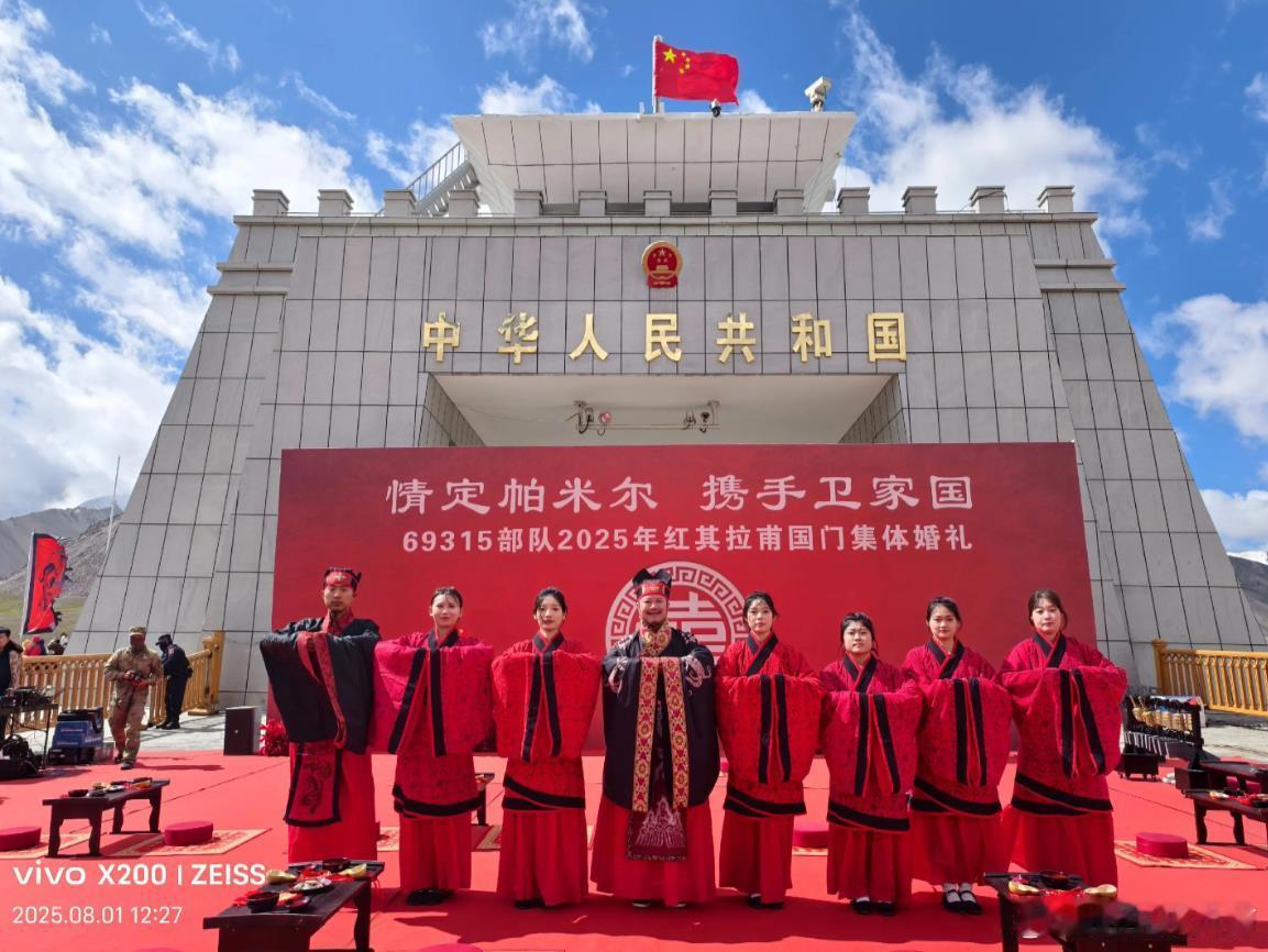 解放军汉服汉旗婚礼的更多照片,2025年八一节边防部队在帕米尔高原红其拉普国门举行的。看照片水印可知。请问某些大V,怎么说不出话来了?你们怎么这么害怕红底黑龙旗?