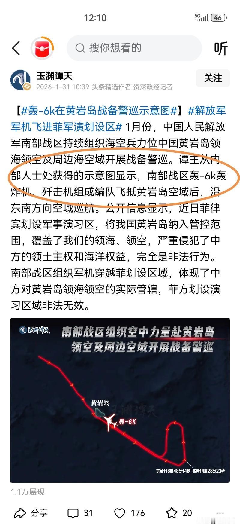 近日菲划设军事演习区,将我国黄岩岛纳入管控范围,覆盖了我国领海、领空 南部战区:无效! 看了玉渊谭天博主的文章,近日菲律宾划设军事演习区,将我国黄岩岛纳入管控范围,覆盖了我们的领海、领空,严重侵犯了中方的领土主权和海洋权益。 如此行径无疑是站在我们头上拉屎撒尿,小小的猴子吃了熊心豹子胆了?南部战区直接启用轰-6K战机带着雷霆之势,精准切入东经118°48′14″、北纬14°28′23″空域,这就是告诉他们,你说划设区就划设区?你问过你南部大爷们了吗! 黄岩亮剑,是坚决维护国家领土!南海的浪涛百年后依旧拍打着礁石,但那道红色的航迹,将会成了所有觊觎中国领土者心中,不敢逾越的红线。