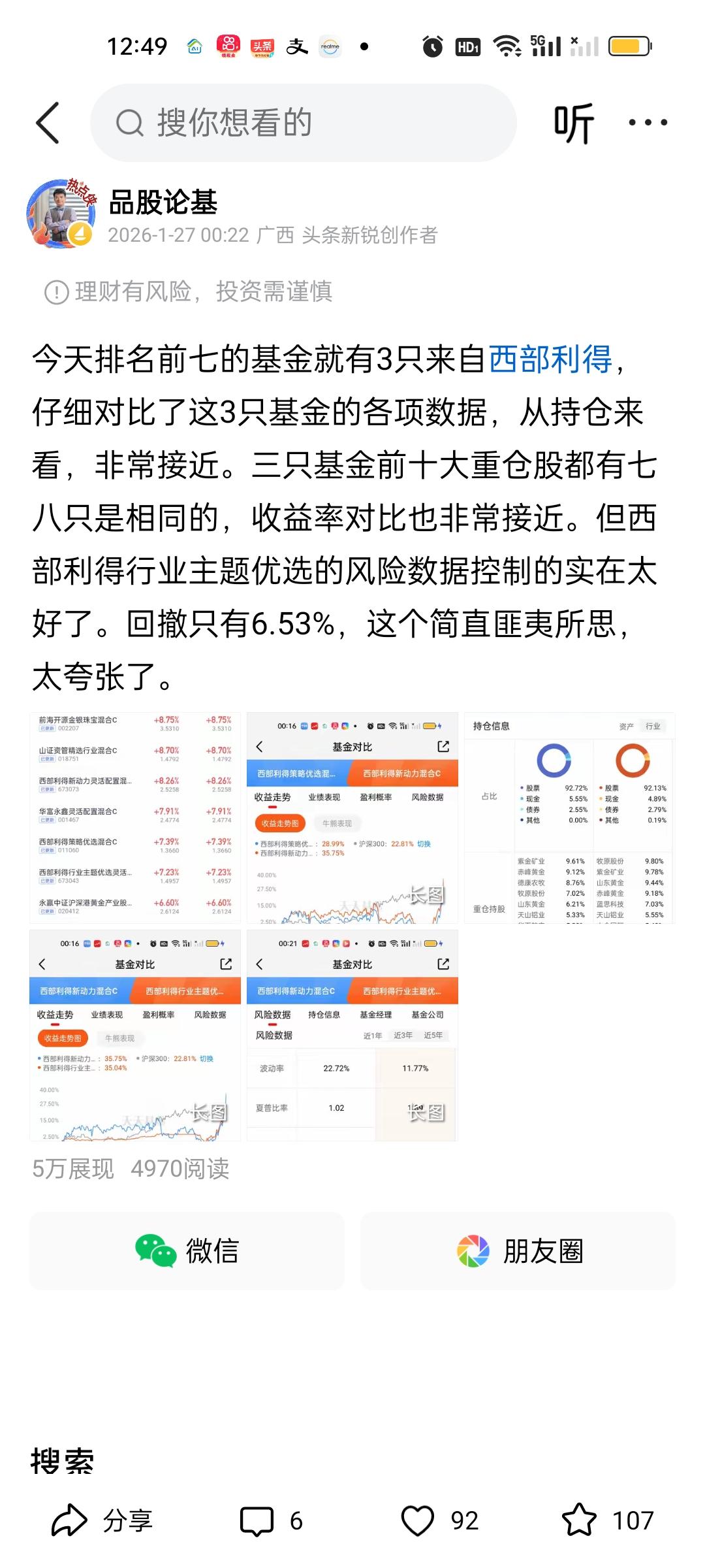 如果实时估值再也看不到了,那每周的收益榜单就会显得至关重要。别看2026年才过去一个月时间,但已经有基金的收益率做到了50%以上。说句实话,不计算复利,这个收益率是非常恐怖的。 西部利得的两只基金今年以来的收益率都做到了50%以上,这也是目前为止整个市场仅有的可以做到50%以上的基金。前海开源金银珠宝49.30%排名第三,第四名还是西部利得。第五名是华富永鑫。收益率为46.77%。 前五有3只西部利得的基金,当然这3只基金我在多天前就做过数据对比。感兴趣的可以去看看。