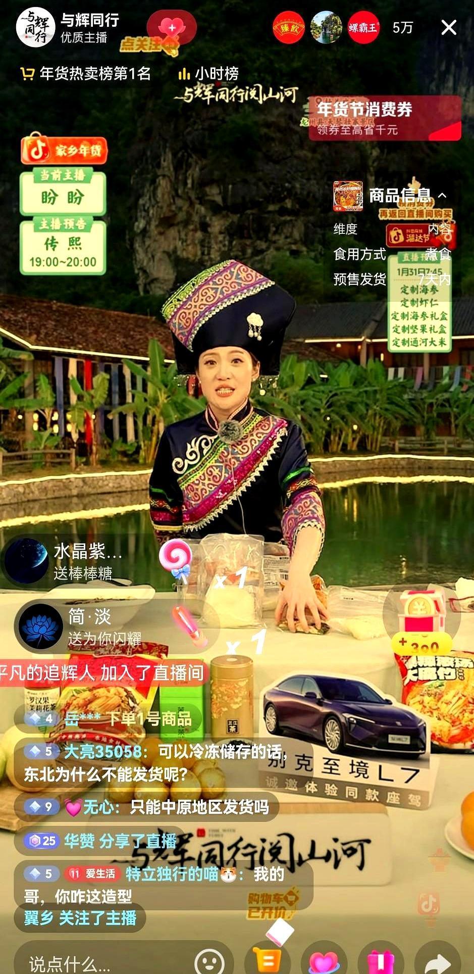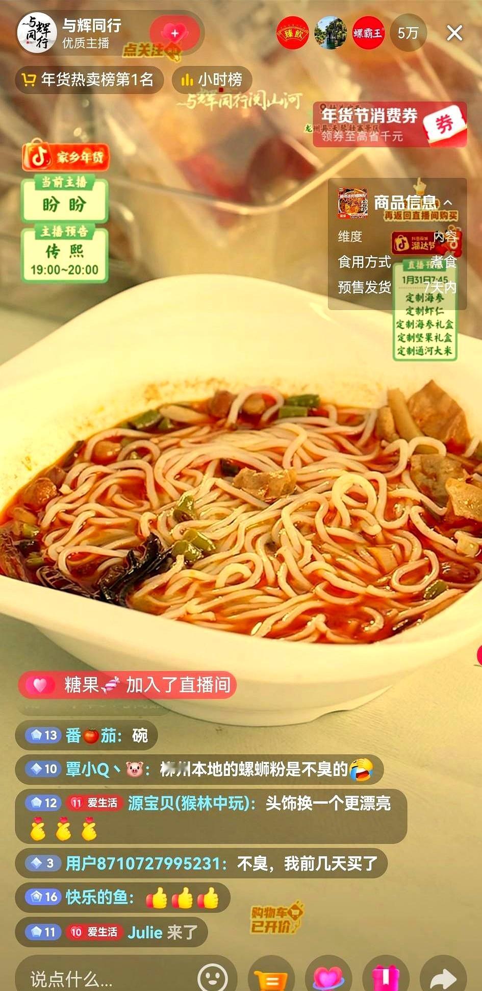 刚才干了一件挺魔幻的事儿,为了几包冰鲜螺蛳粉,在“与辉同行”直播间里杀红了眼。