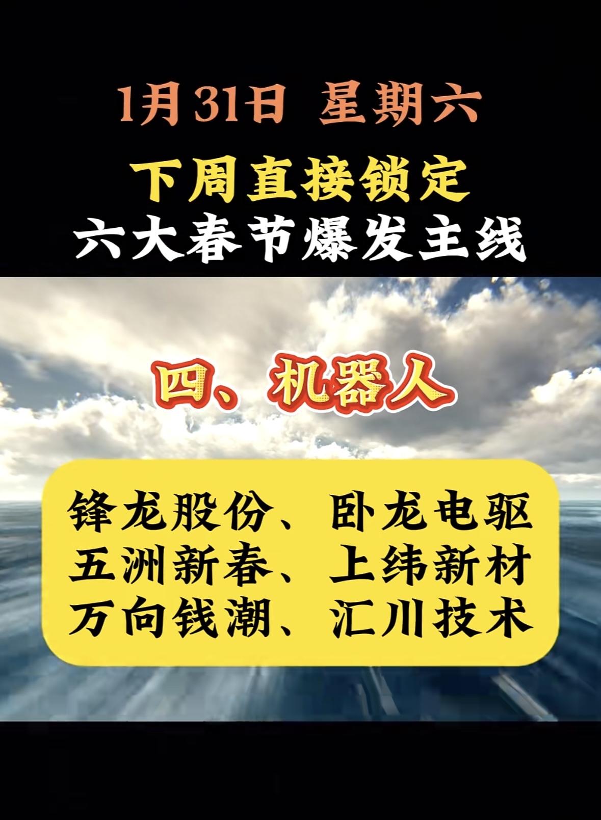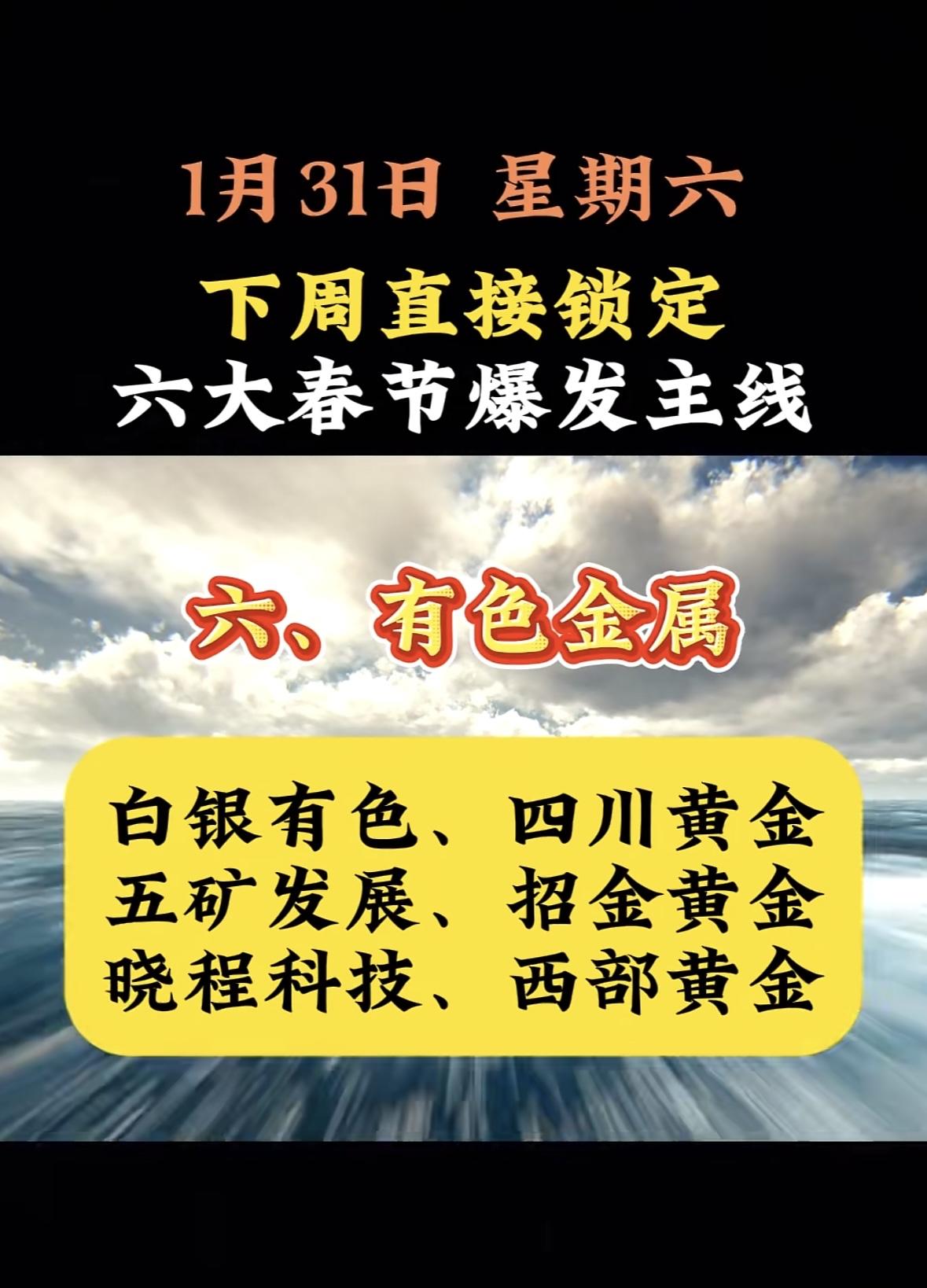 “下周六大热门板块六大发,有色金属大爆发!”💰🔥🚀 "春节行情聚焦AI应用,蓝标、浙文等六股蓄势待发,下周重点布局数字营销赛道。" 春节投资聚焦AI应用,关注蓝标、浙文等潜力股,把握爆发主线机遇。