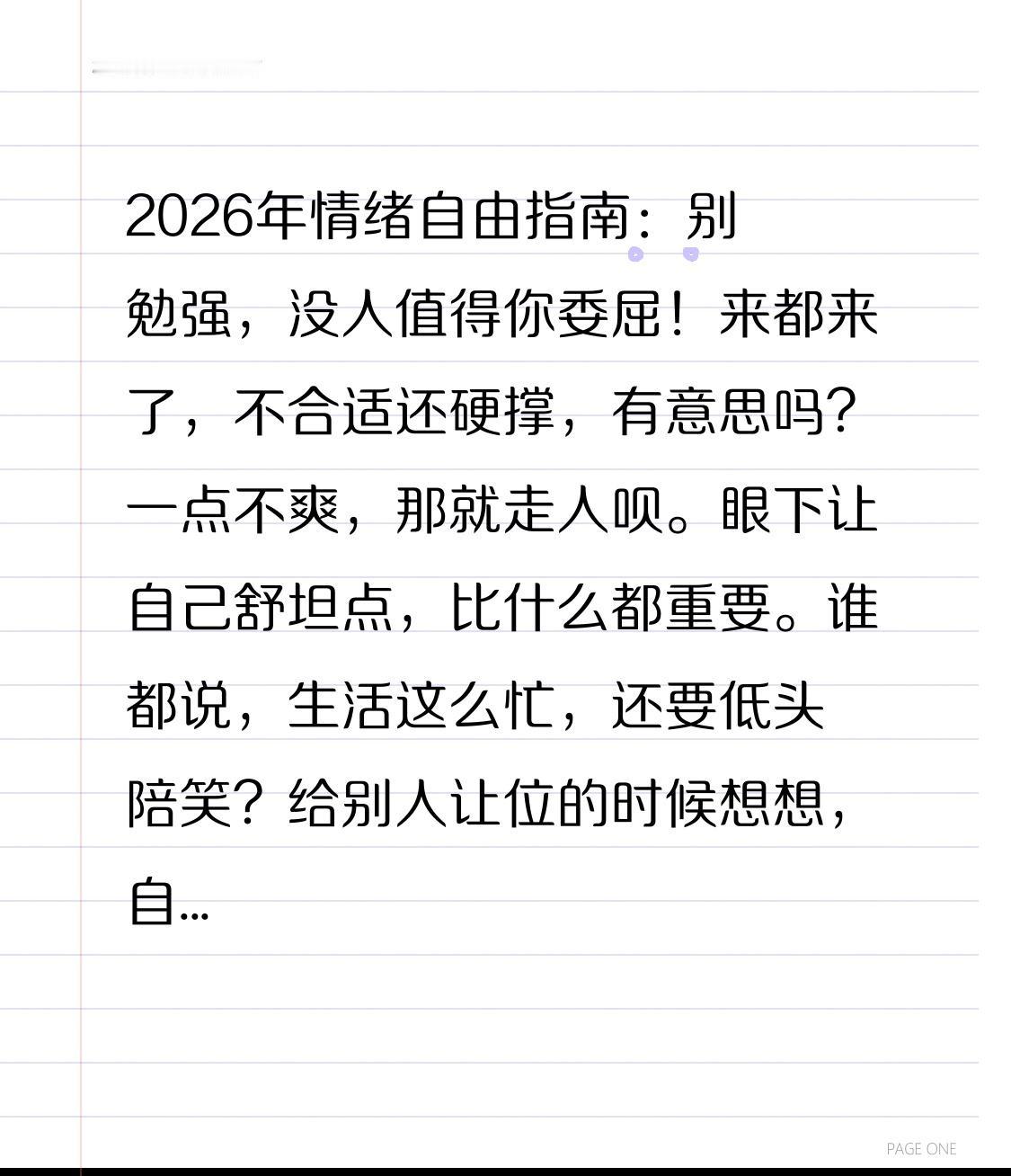 2026年情绪自由指南:别勉强,没人值得你委屈! 来都来了,不合适还硬撑,有意思吗?一点不爽,那就走人呗。眼下让自己舒坦点,比什么都重要。 谁都说,生活这么忙,还要低头陪笑?给别人让位的时候想想,自己的感受值不值钱。喜欢就留,不喜欢赶紧溜,没必要死磕。 新的一年,啥都别将就,对得起自己才叫活得明白。2026年,没有比你自己的心情更该被顶在最前面的事了。请允许自己情绪 调整情绪文案 情绪自愈指南 请允许我有情绪