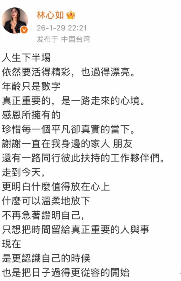 林心如发文庆祝自己50岁生日! 直言年龄只是数字,人生下半场依然要活的精彩,过的漂亮,林心如与霍建华在生日会上现场合唱,一众好友前来为林心如庆生, 林心如的状态完全看不出50岁的年纪,依旧美丽。