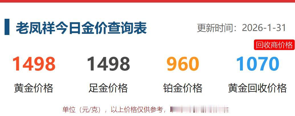 如果黄金暴跌,你会买吗? 随着贵金属市场 遭遇黑色星期五, 国际金价大幅暴跌, 国内受其影响,黄金饰品价格也是大幅回落。 以上海为发展基地的 老凤祥品牌,也大幅调整价格。 1月31日 老凤祥的黄金饰品价格为1498元, 比昨日价格回落了170元; 铂金饰品价格为960元; 黄金回收价格为1070元。