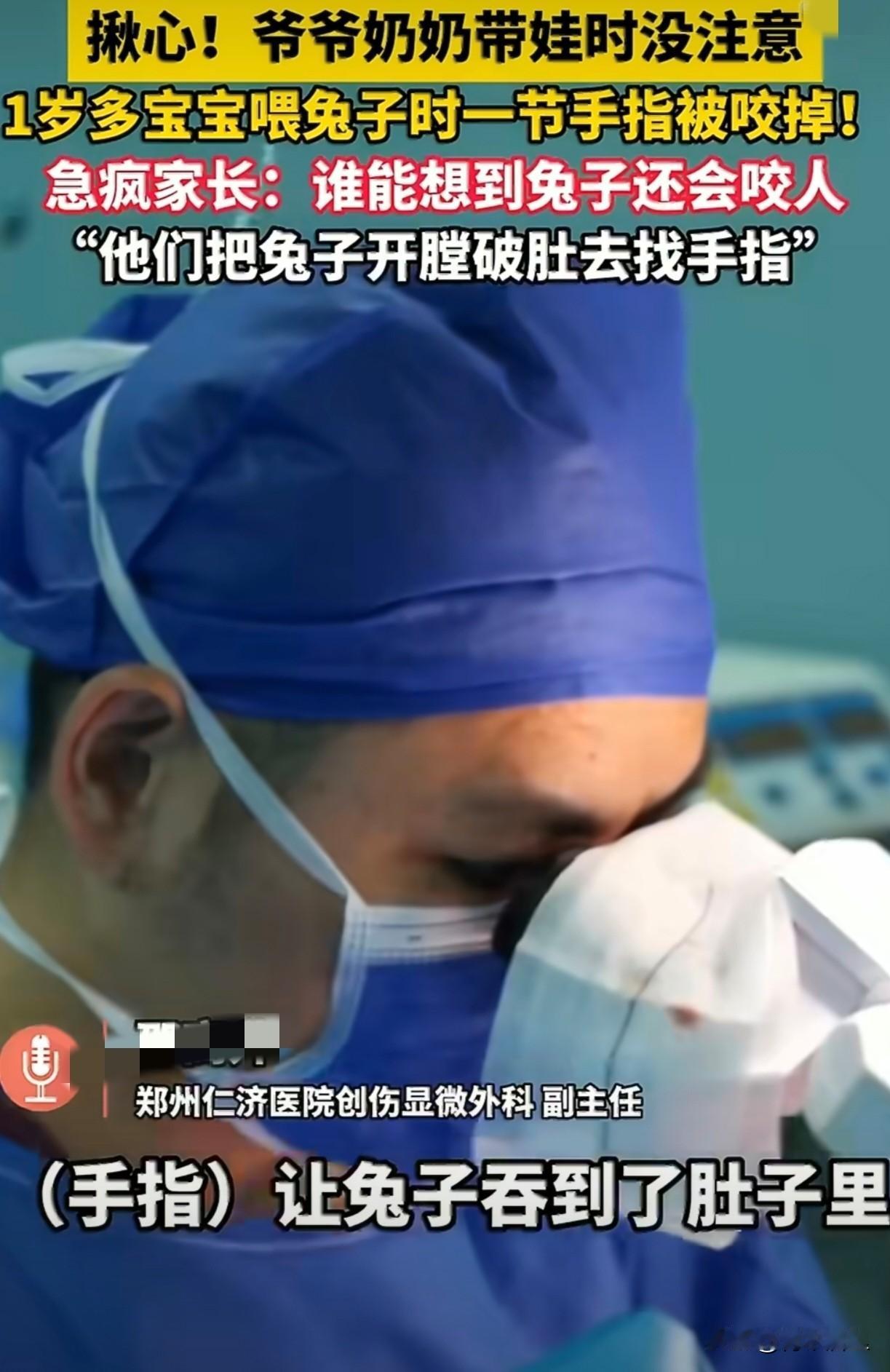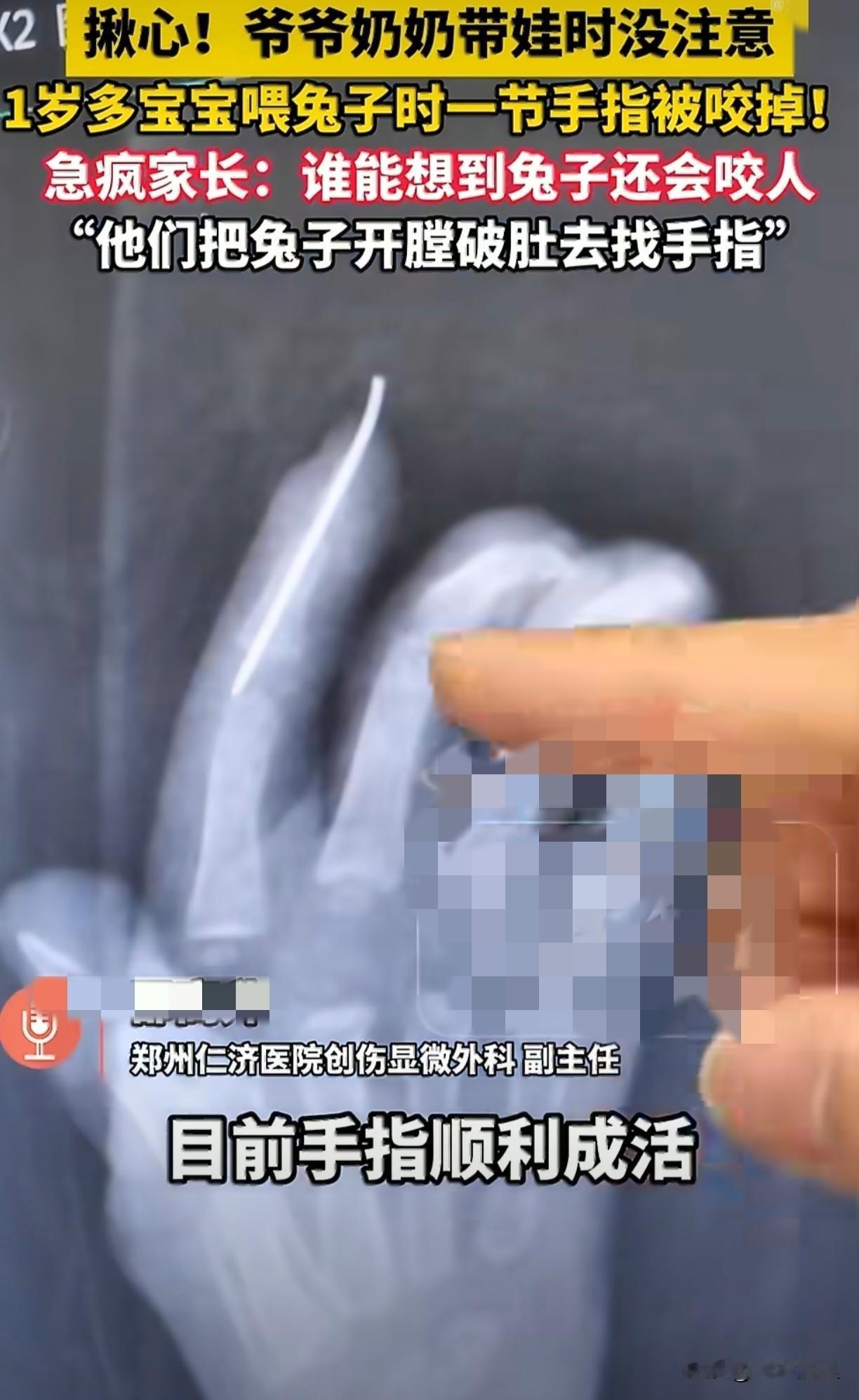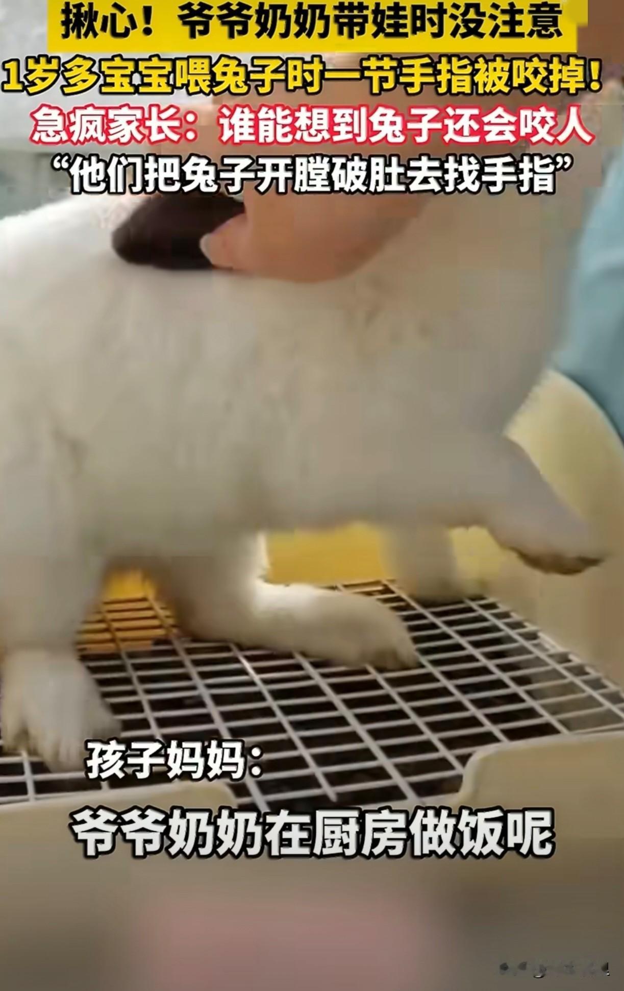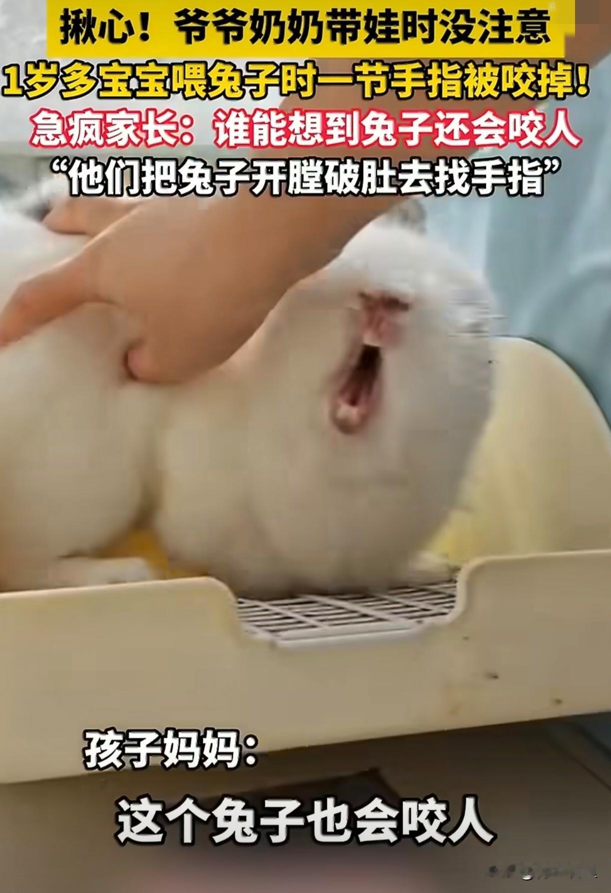 兔子急了也咬人,这并不是一句空话呀,在现实生活中,实打实的存在。 最近,在河南发生了这样一件事,爷爷奶奶在厨房做饭的时候,一个1岁多的宝宝给自家的兔子喂食,右手食指的末节不慎被兔子咬断。 家长一开始没找到断掉的手指,以为被兔子吞了,就把兔子开膛破肚,结果也没有找到,最后在兔笼的角落,才发现断掉的手指。 目前经过治疗,孩子的断指已经成功接活。 之前在网上看到一个视频:“兔兔那么可爱,你怎么可以吃兔兔”。很多人会习惯性的认为兔子,仓鼠这类小宠物没有攻击性。个人认为这是一种误解,没有绝对温顺的动物,在受到惊吓或者感到威胁的时候,都是有可能主动攻击的。 孩子的手指成功找到并接活,这算是不幸中的万幸了。这件事也给所有养宠物家庭敲响了警钟。在日常生活中,一定要格外注意孩子与宠物的相处安全。