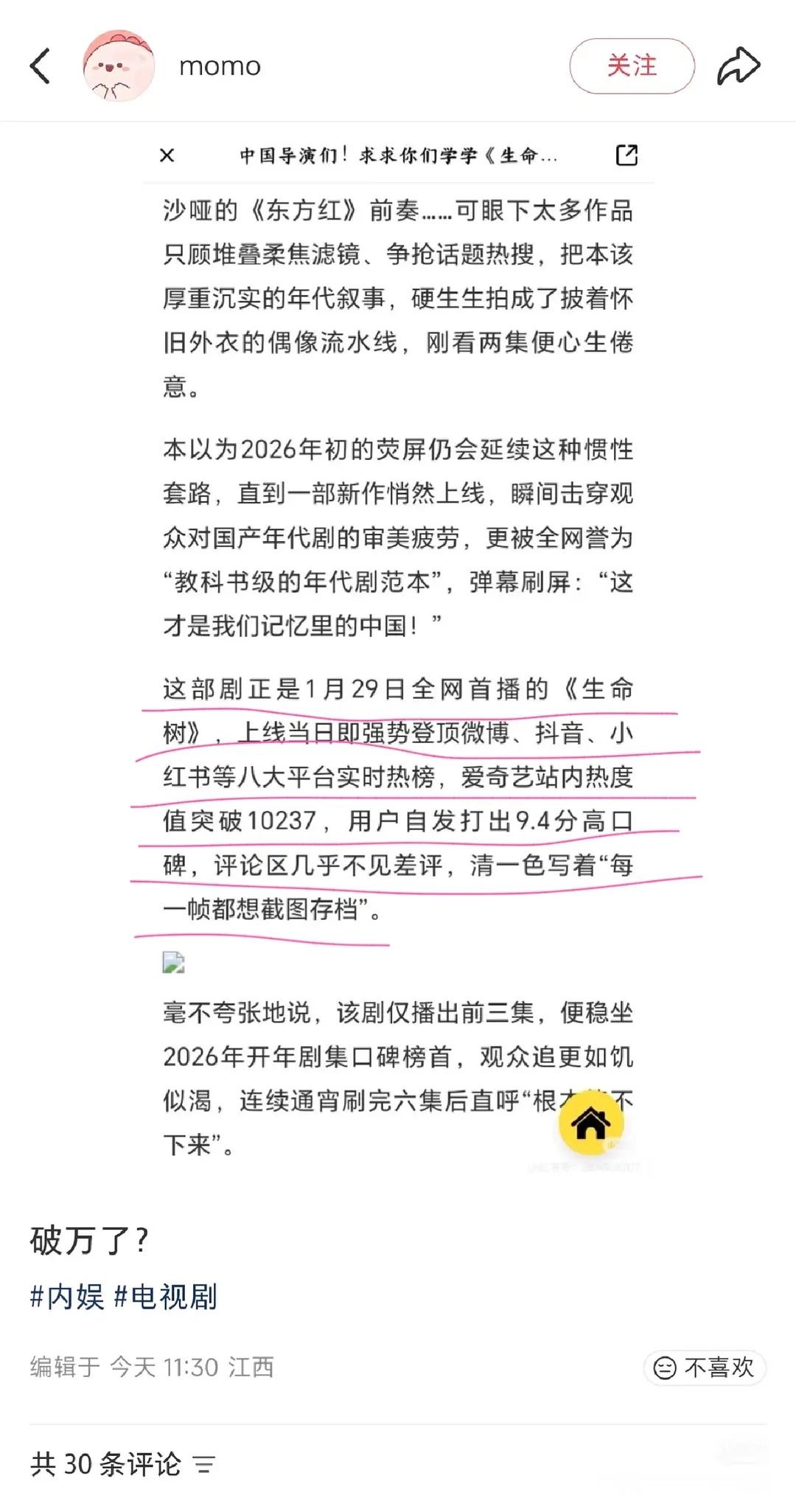 恭喜生病🌲热度破万,2026爱奇艺第一预制剧。虽然收视率首播扑了,但是网播已经预制破万,恭喜!