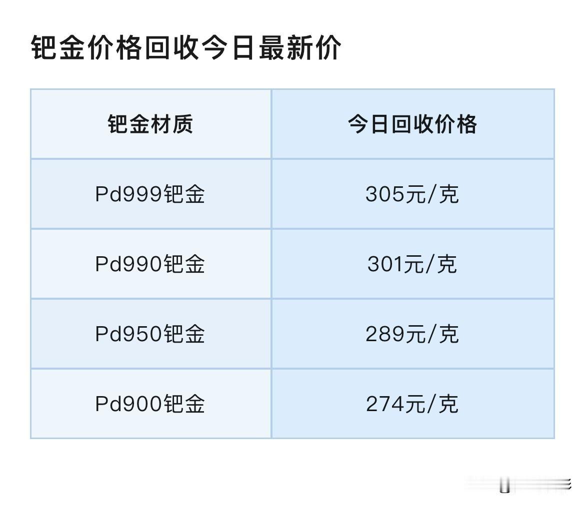 今日铂金、钯金报价!以及铂金钯金回收报价查询! 那么先来看看,不同品种铂金回收价格是多少钱一克了? PT999铂金回收价格454元/克,PT990铂金回收价格449元/克,PT950铂金回收价格431元/克、PT900铂金回收价格408元/克。 同昨天铂金各品种回收报价相比较,今天铂金各品种回收价格都整体下跌了。 PT999铂金回收价格下跌了90元/克,PT990铂金回收价格下跌了89元/克,PT950回收价格各分别下跌了85元/克,PT900铂金回收价格下跌了81元/克。 再来看看,不同品种钯金回收价格是多少钱一克了? Pd999钯金回收价格305元/克,Pd990钯金回收价格301元/克,Pd950钯金回收价格289元/克,Pd900钯金回收价格274元/克。 同昨天不同品种铂金回收报价相比较,今天不同品种钯金回收价格也都整体下跌了。 Pd999钯金、Pd990钯金回收价格各下跌了68元/克,Pd950钯金回收价格下跌了65元/克,Pd900钯金回收价格下跌了61元/克。 根据黄金网消息:今日金价银价大幅跳水,现货黄金一度失守4900美元跌至4686美元的低点,较日内高点5450美元回落近760美元,跌幅一度超12%,创最大单日跌幅!现货白银一度失守74美元最低下探至73.49美元,跌幅一度超36%。铂金与钯金价格同步下跌,跌幅超15%。 截至今天上午11时10分,现货黄金下跌9.61%至每盎司4860美元,现货白银下跌26.8%至每盎司84.4美元,现货铂金下跌17.8%至每盎司2164美元,现货钯金下跌15.4%至每盎司1698美元。 至于国际金价的下跌深度,市场策略师伊佩克·奥兹卡德斯卡亚认为:国际金价可能下探4600美元/盎司这一重要支撑位。 同时,国际金价也可能被视为巩固多头仓位的好时机,因为推动金属价格上涨的动力来源包括持续增长但并非可持续的欧美政府债务、对美元需求的减弱、贸易和地缘政治的不确定性、寻找能够在未来地缘政治混乱中保值的超主权资产等因素目前仍在发挥作用。 另外要注意:铂金回收有这以下4个知识点,特别的重要,谨防上当吃亏。 第一,铂金回收是不需要发票和以前的购买凭证的。如果有人跟你说因为没有发票要扣你手续费,那他一定是在坑你。 第二,铂金回收是没有折旧费一说的,不管你是戴了几十年还是刚刚买的,回收的时候只看重量和纯度,只要纯度是3个9以上的,回收价格都是一样的。 第三,卖之前一定要知道自己首饰的精准克重,以防被其他人偷秤。 第四,铂金回收就是按照当天的国际金价减个几块钱一克回收,所以要提前查一下当天的国际金价。 只要注意这4点,根本没有人能够坑得到你。 最后说声,所有信息,都只是提供参考价值! 投资有风险,理财需谨慎 铂金价格 铂金回收行情 铂金价格波动 铂金回收价 钯金价格 钯金市场 铂金钯金价格