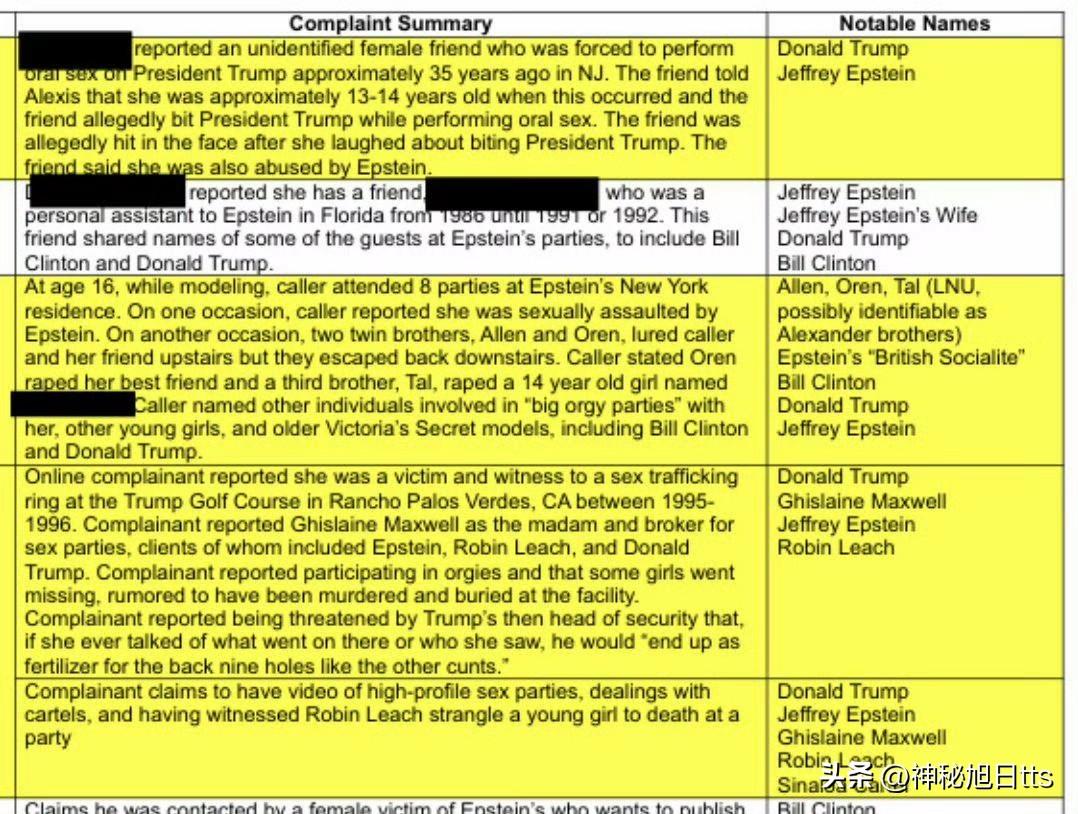 根据美国司法部周五公布的电子邮件,美国联邦调查局官员去年夏天汇总了一份摘要,内容涉及十余条有关特朗普和爱泼斯坦的举报线索。 目前尚不清楚调查人员为何整理这份摘要。摘要包括一些针对爱泼斯坦和特朗普的性侵指控,并多次提到特朗普性侵和强奸女性。 这些邮件中没有包含任何佐证证据,其中一些举报内容涉及的事件与此前政府已经公开的文件中提到的案件相关。 副司法部长托德·布兰奇在周五的新闻发布会上表示,白宫没有参与爱泼斯坦相关文件的审查。他还表示,这些文件中没有任何材料会引发新的刑事起诉。 周五早上,这些邮件与数百万份与爱泼斯坦有关的文件一起发布在司法部网站上,但相关链接数小时后失效,随后恢复。 司法部一名女发言人表示,文件链接失效是因为“访问量过大”。 在上个月的一次文件发布中,司法部曾上传一张照片,照片中有一个写字台,上面摆放着包括特朗普在内的多张照片。随后图像被撤下。司法部官员称撤下是为了确保其中不包含受害者的图像,之后重新上传到了爱泼斯坦文件的在线资料库中。 在此次公开的同一封邮件链中,还有另一份摘要,内容同样是举报线索,其中也包括发送给纽约南区联邦检察官办公室的内容。这些内容显示调查人员至少对部分线索进行了跟进。一些备注指出部分线索缺乏可信度,还有些举报者未提供联系方式。 文件记录了对部分线索的调查尝试。但举报者的姓名被涂黑,文件第二部分中标注“犯罪记录”的栏位内容也被遮盖。目前尚不清楚司法部对这些线索的最终处理结果。