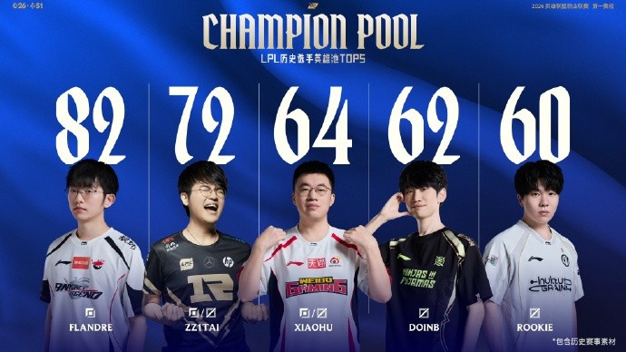 图一为LPL历史选手英雄池TOP5榜单,第一名为Flandre;第二名为Zz1tai;第三名为Xiaohu;第四名为Doinb;第五名为Rookie