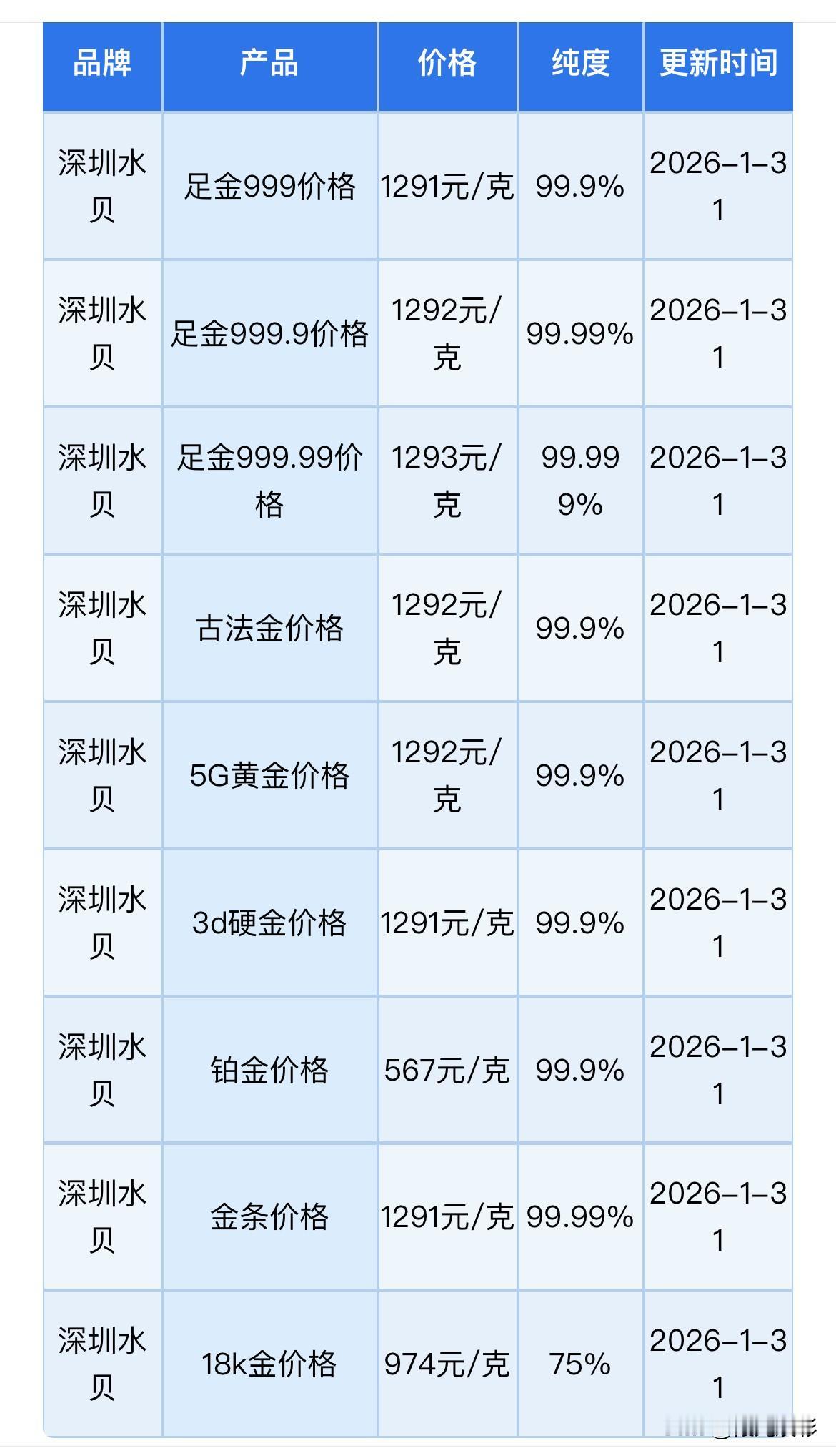 今日深圳水贝黄金批发报价!以及在水贝市场购金技巧! 那么来看看,现在深圳水贝黄金批发价格是多少钱一克了? 水贝足金999价格1291元/克, 水贝金条价格1291元/克, 水贝古法金价格1292元/克, 水贝铂金价格567元/克。 同昨天深圳水贝黄金及各品种批发报价相比较,今天各品种又都整体下跌了。 金条、足金3个9、4个9、5个9、古法金、5G黄金、3d金硬金批发价格各分别下跌了38元/克,18k金批发价格下跌29元/克,铂金批发价格下跌了52元/克。 今日(2026年1月31日)水贝黄金批发报价为每克1291元,工费另计,不同的黄金款式工费有所差异(每克10元至35元不等)。 今天下午深圳水贝金条回收价格1080元/克,金饰品回收价格1075元/克,铂金回收价格469.5元/克,白银回收价格是20.6元/克。 根据黄金消息:今日金价银价大幅跳水,现货黄金一度失守5000美元跌至4942.69美元的低点,较日内高点5450美元回落近510美元,跌幅一度超8%;而现货白银一度失守100美元最低下探至94.85美元,跌幅一度超17%。铂金与钯金价格同步下跌,跌幅超10% 有关,前海开源基金首席经济学家杨德龙分析: 黄金白银在经历大幅快速上涨后出现暴跌,这也在情理之中。 前期的快速上涨累积了大量获利盘,存在很强的获利回吐需求,这也提醒投资者在金价快速上涨时不宜追涨,一旦追涨很可能被套牢。 杨德龙还强调,以上提醒都是针对短期操作,从长期来看,在美元发行量不断增加且美国政府债台高筑的背景下,金价长期向上的核心逻辑依然稳固。 并且,还有多名黄金从业人士也分析指出:最适合普通投资者的黄金投资方式是长期定投,短期博弈并不可取,尤其不要加杠杆操作。 此前,世界黄金协会中国区CEO王立新接受专访时也表示,普通投资者投入黄金的比例最好别超过总资产的20%,可以先拿出2%—3%的可支配资金试水,慢慢再增加到5%左右,也可以通过定投的方式平滑买入成本,这样肯定不会都买在高位。 来分享个选黄金三技巧: 1,那么怎么选黄金呢? 首先黄金不需要选品牌,因为黄金的纯度一样,只是品牌溢价导致价格有所不同,建议哪家合适买哪家,尽量不要选一口价金饰,折算下来每克单价太高,建议按克购买最划算。 2,如何判断我买的黄金是否是纯金? 直接看内壁的钢印,3个9和4个9代表黄金的纯度,足金上面印有AU 999、G999和足金999的字样,如果只有999,你真的要当心。 3,那3D 5G古法金是真的黄金吗?这里有什么区别? 3D 、5G和普通黄金都是真黄金,只是工艺不同,加工过后硬度更高,不容易变形。古法黄金是纯手工制作,工艺性更强。 再来分享个,散客怎么在深圳水贝购买黄金呢? 1、金展珠宝广场负一楼,柜台很多,黄金款式多,适合散客逛购买,不过人多拥挤。 2、水贝国际、金座、壹号、银座、特力等是贯通的,这里除了黄金还有铂金、钻石、翡翠、珍珠等,人没有那么拥挤。 另外,要申明一下: 水贝是全国最大的黄金批发市场,批发价格是国际金价+手工费(不同的工艺,工艺费不一样)。 还有哦!水贝的黄金纯度是没有问题的,不放心的话,可以在附近找NGTC机构进行检测。 再就是,在水贝购买黄金是没有包装盒的,另外卖出去的黄金是离柜概不退换的,除非有明显的质量问题,所以购买之前一定要确定好款式再入手,买单之前一定要仔细检查没有问题在付款。 最后就是,网店或者直播等销售的水贝黄金,如果报价远低于黄金行情,就需要注意了。 所有信息,都只是提供参考价值! 购买黄金有风险,投资需要谨慎,不要盲目跟风! 水贝黄金暴雷 水贝黄金打金 广东黄金价格 水贝黄金工费 惠州水贝黄金 水贝黄金配货 深圳黄金按克卖