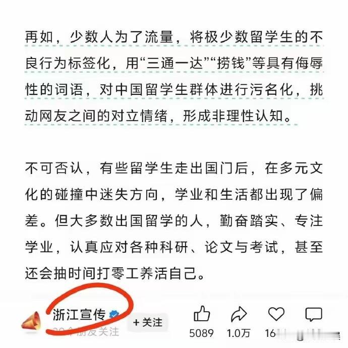牢胡的反击来了! 直接晒出浙江宣传的文章。 来驳斥牢A的言论。 沉寂许久的胡锡进还是舍不得牢A这波流量,直接开始反击他的观点。 晒出了浙江宣传的文章,说很多留学生都是很努力的,只有极其少的才是牢A所说的。看来牢胡是找到了反击的切入点了,以后再有人喊话牢胡,他就会推荐你看这篇文章了。