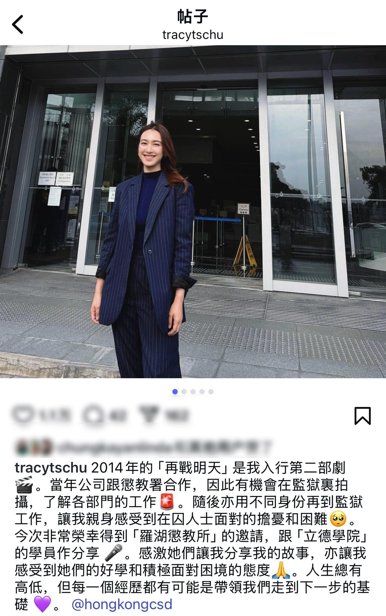 朱千雪到访惩教所与在囚人士分享,回忆当年在现场拍摄剧集《再战明天》,鼓励积极面对困境。