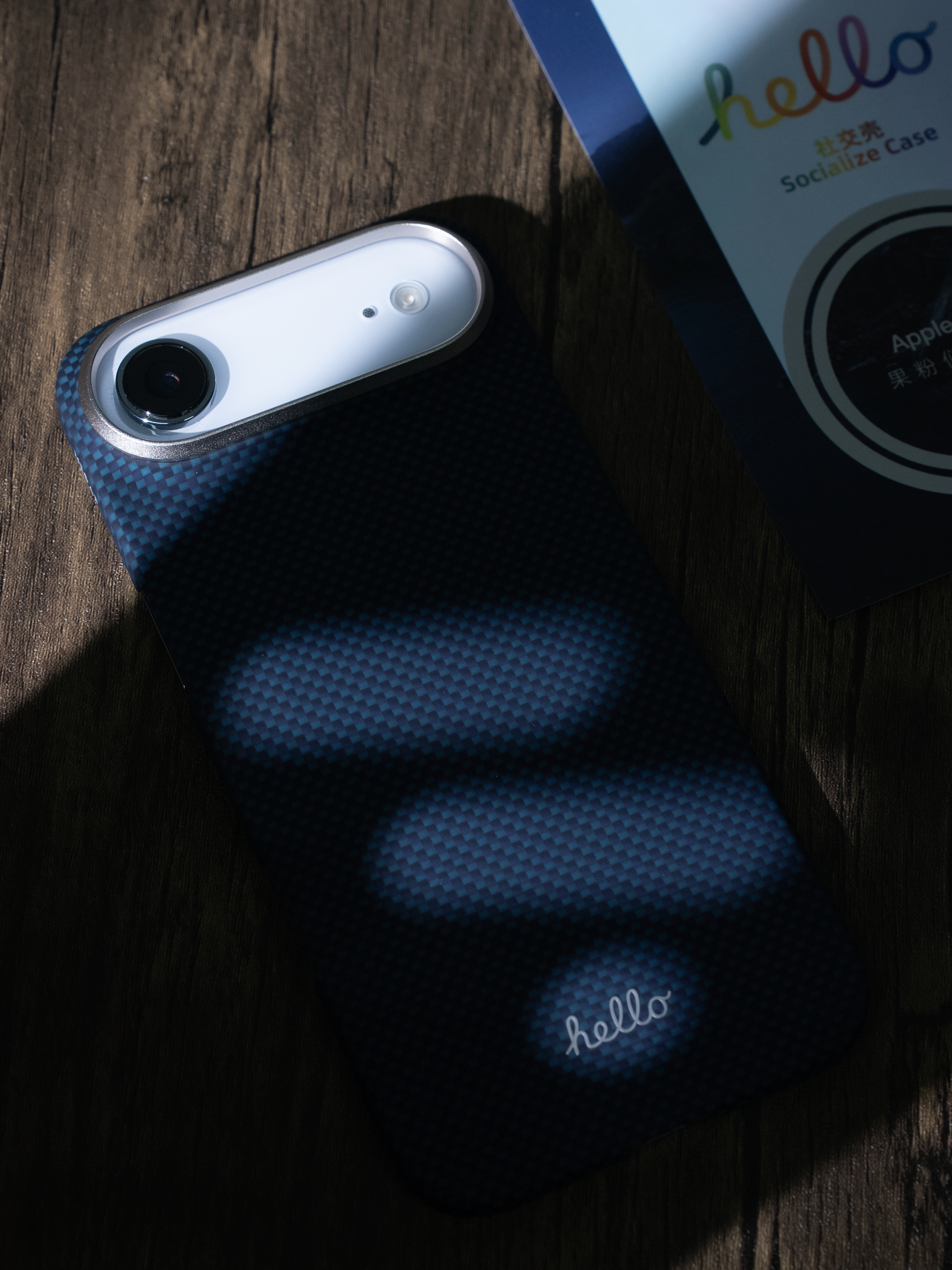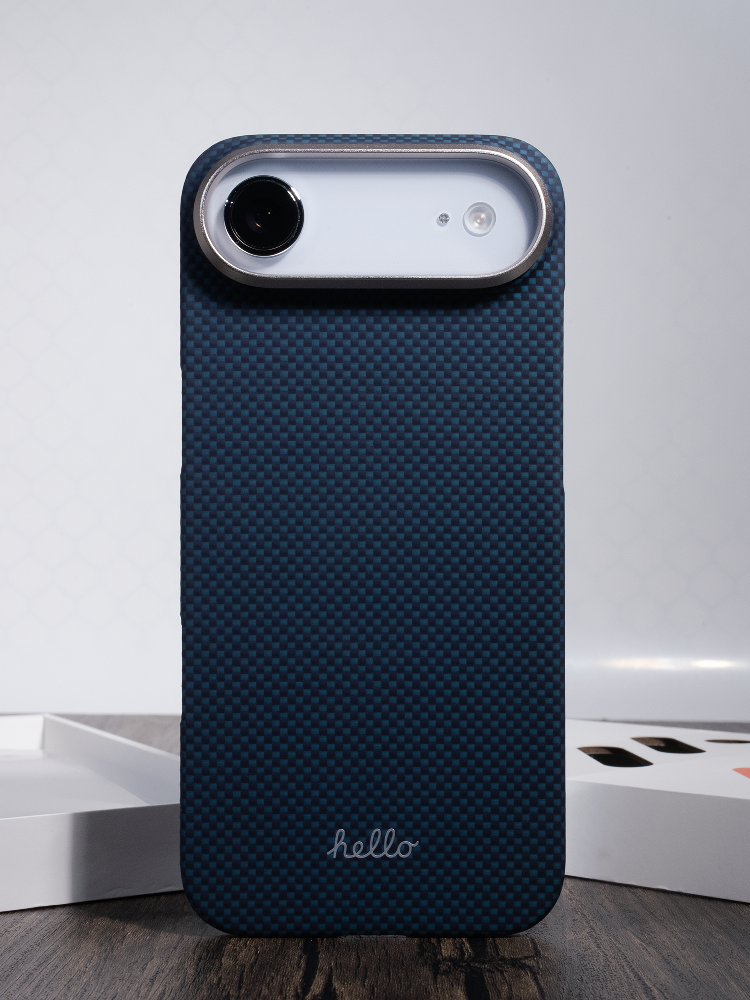 整壳采用 1500D 浅蓝 + 深蓝编织棋盘格,结构经典但不显厚重,视觉简约、耐看,拿在手里非常轻盈,几乎不会破坏 Air 原本的重量分布和手感。编织材质本身有一定摩擦力及颗粒感,防滑但不涩手,日常使用很舒服。细节部分处理得也比较精致:背部点缀了苹果经典 “hello” 金属镍片字标,字体立体;镜头位置搭配 银色航空铝合金镜头圈,精度和边缘处理到位,整体观感干净、有秩序,不会喧宾夺主。这款产品,真的是从手感、重量控制和细节完成度上,尽可能的把 iPhone Air 的优势给体现出来了。我看了一下,目前店铺的实际到手活动价在 ¥222,以这个做工、材质和整体完成度来看,性价比真的非常高了