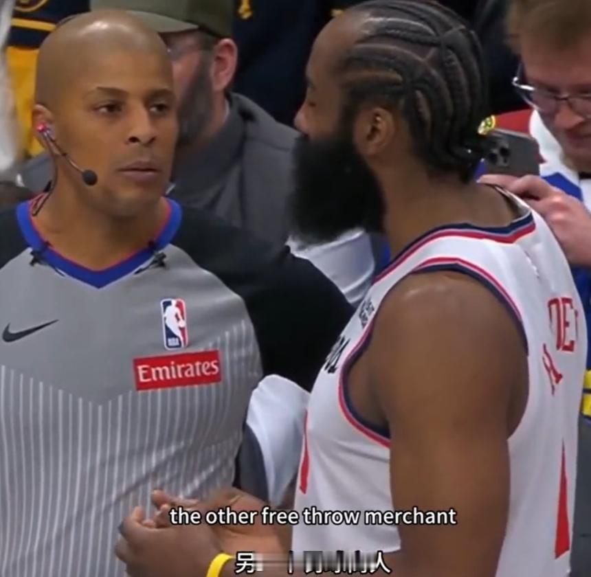在哈登与裁判沟通的时候,掘金的解说员的原话是:free throw merchant,这是带有贬低意味的词汇。