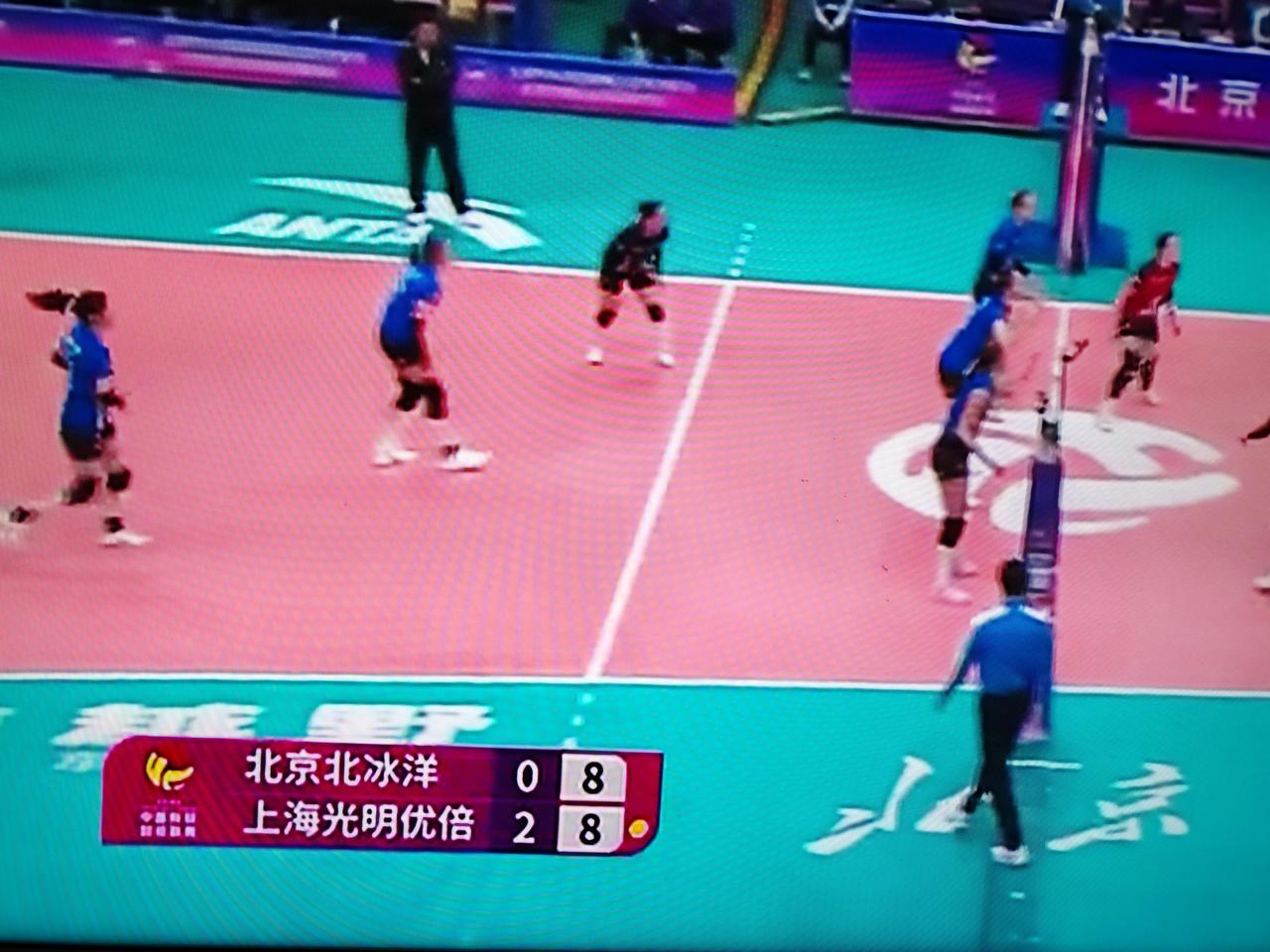 女排排超联赛第十三轮,上海女排对阵北京女排,前两局上海女排2:0领先,比赛进入第三局,陈厚羽拦网得分1:0,金佳宝快球得分1:1,单兰沣发球,北京队扣球得分1:2,范赖克四号位吊球得分2:2,沃龙科娃发球失误2:3,北京队发球失误3:3,陈厚羽发球,北京队法布里斯扣球得分3:4,法布里斯发球,仲慧打探头得分4:4,沃龙科娃扣球失误4:5,仲慧扣球得分5:5,仲慧发球失误5:6,第三局上海女排失误增多,高意背飞得分6:6,高意发球,范赖克扣球得分7:6,北京队连续吊球得分7:8,沃龙科娃拦网得分8:8。女排全国联赛 女排联赛 上海女排