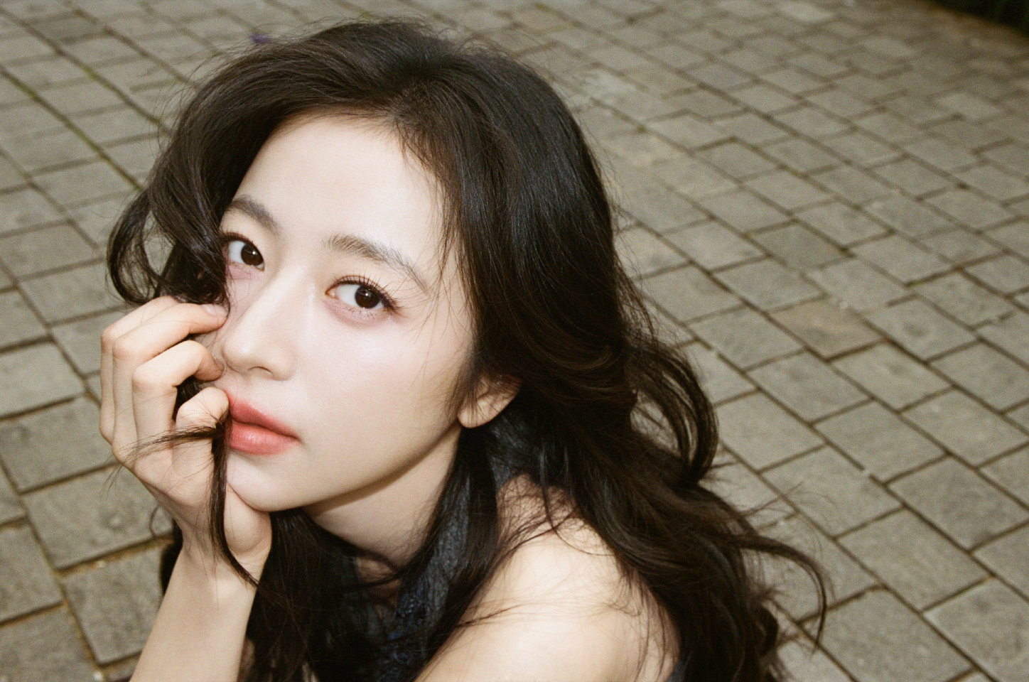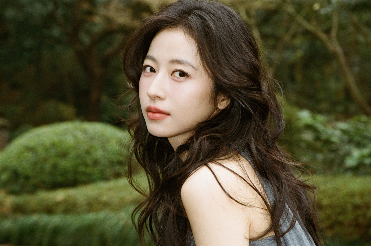 周雨彤一袭抹胸长裙湛蓝绽放