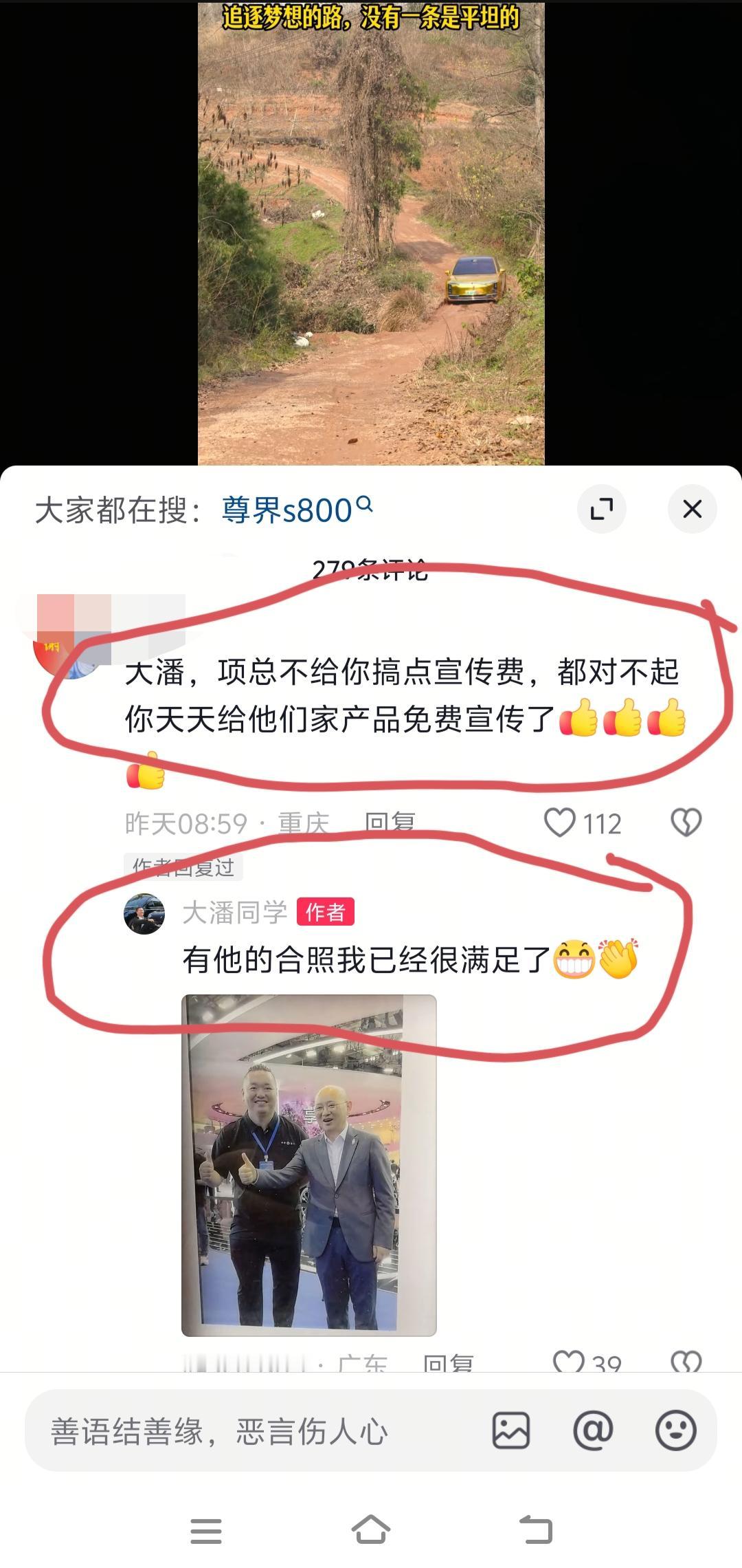 这个大潘同学那么卖力宣传尊界,原来并不是得了什么好处费,而仅仅是因为一张合照啊! 自从成为尊界S800车主之后,大潘同学就没闲过,不是在宣传尊界,就是在宣传尊界的路上,宣传方式上还花样百出。最吸引眼球的就是他将自己的尊界S800用改色膜贴成了土豪金颜色,并在车管所备案后合法上路,还租借给广东云浮、广西灵山等地的多个鸿蒙智行车友当婚车使用,还牵头组织了以尊界S800和问界M9为主的鸿蒙车友婚车队,在接亲路上风头无俩。他还通过开尊界S800回老家请父老乡亲吃“刨猪汤”,展示尊界在乡间泥路的通过性,甚至自己亲自扮演“皇上”吸睛,直言坐上“龙椅”也比不上尊界S800后排的零重力座椅舒服。 有网友在评论区问大潘,他天天这么卖力宣传尊界,江淮汽车的项总有没有给他搞点宣传费什么的,你猜大潘怎么说?他居然晒出自己和江汽集团董事长项兴初的合照自豪的说“有他的合照我已经很满足了!” 这大概就是余承东所说的“自来水”和尊界高净推荐值的生动例子吧! 无关利益,只为热爱;一张合照,便是满心荣光。大潘不是个例,是无数鸿蒙智行车主的缩影,他们用自己的方式为国产品牌发声,这才是最珍贵的“自来水”,也是尊界能快速出圈的核心底气。不用一分钱推广费,全靠真心喜欢撑场面,从大潘的热情推介,到车主自发站台,车友主动组队,这种发自内心的认可最有说服力,也正是余承东口中“自来水”的最好模样。华为入局智驾的鲶鱼效应 鸿蒙智行 江淮汽车 华为新车技术探讨 分享华为的好玩事儿 探讨华为汽车 尊界挑战豪车 尊界豪华体验 尊界汽车 尊界S800 尊界s800
