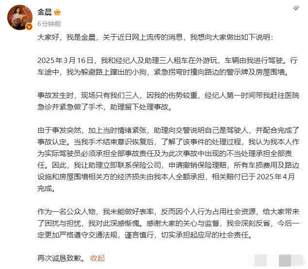 没想到金晨和助理经纪人开车出去玩,居然是金晨当司机开车,助理和经纪人坐后排休息,金晨也太宠他们了吧! 一般明星和同事出去玩,都是助理或者经纪人开车,明星做后排休息,金晨却反着来,让助理和经纪人休息,自己当司机。 要么是金晨喜欢开车硬要自己开,要么就是助理和经纪人不会开车,不然哪有老板当司机,员工坐后排休息的道理。 我更倾向于是金晨自己喜欢开车,毕竟是开过赛车的人,更想时刻展示自己的车技,没想到这次属实“阴沟里翻船了,”为了躲避突然跑出来的小狗,她急打方向盘撞上了路边警示牌和房屋围墙。 金晨事件告诉我们,开车遇到突发状况,一定不能急打方向盘,避免引发二次险情。