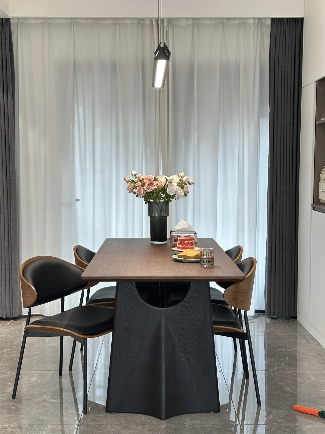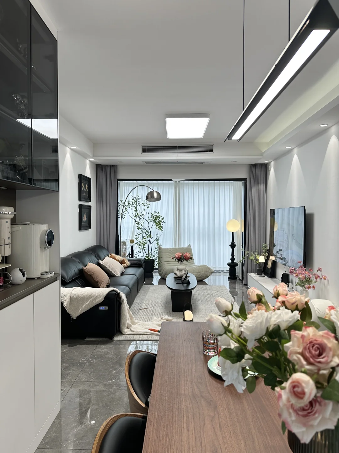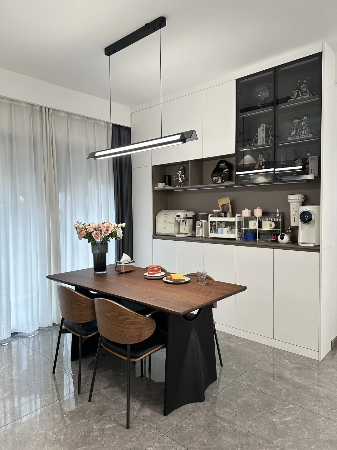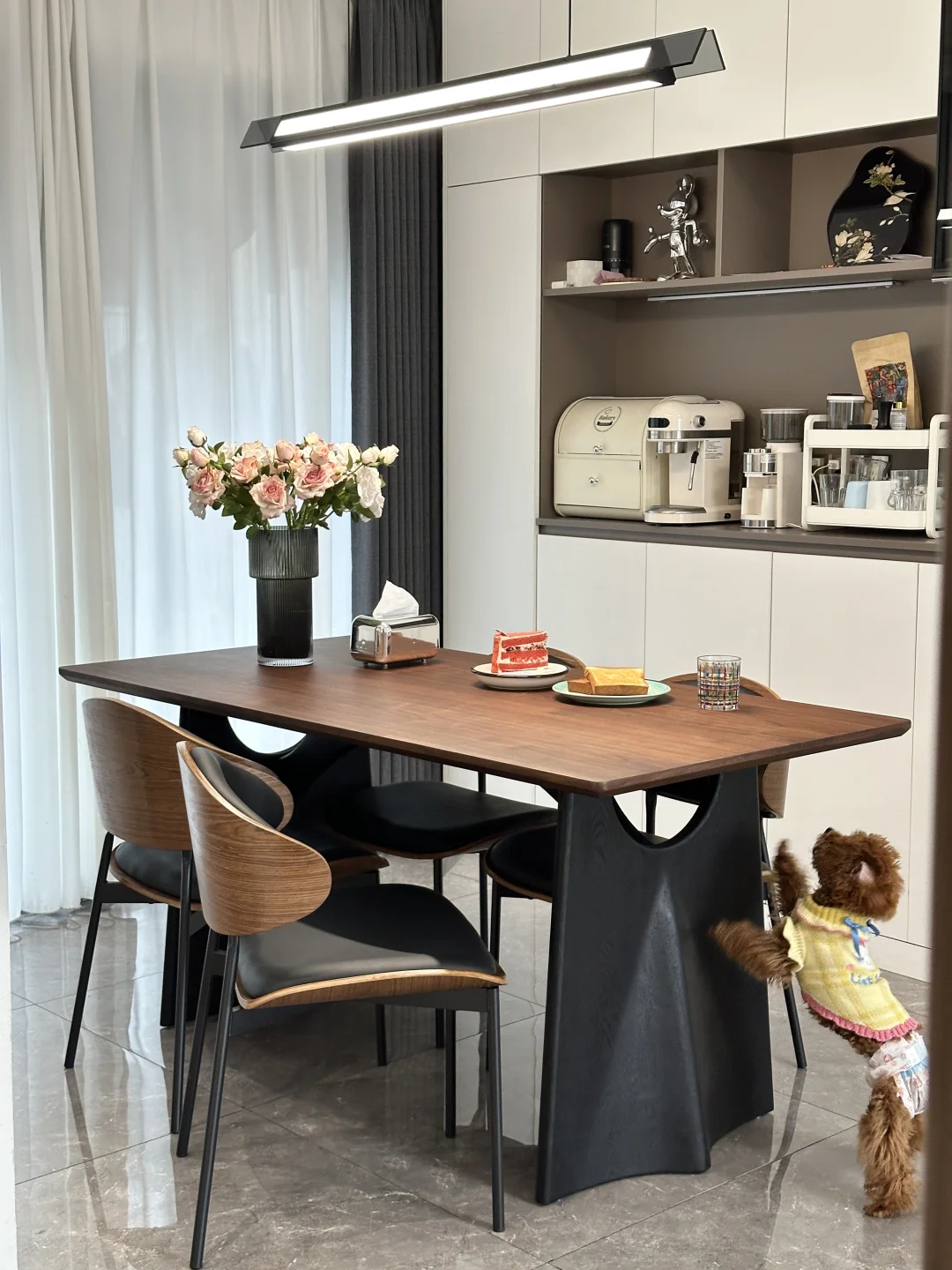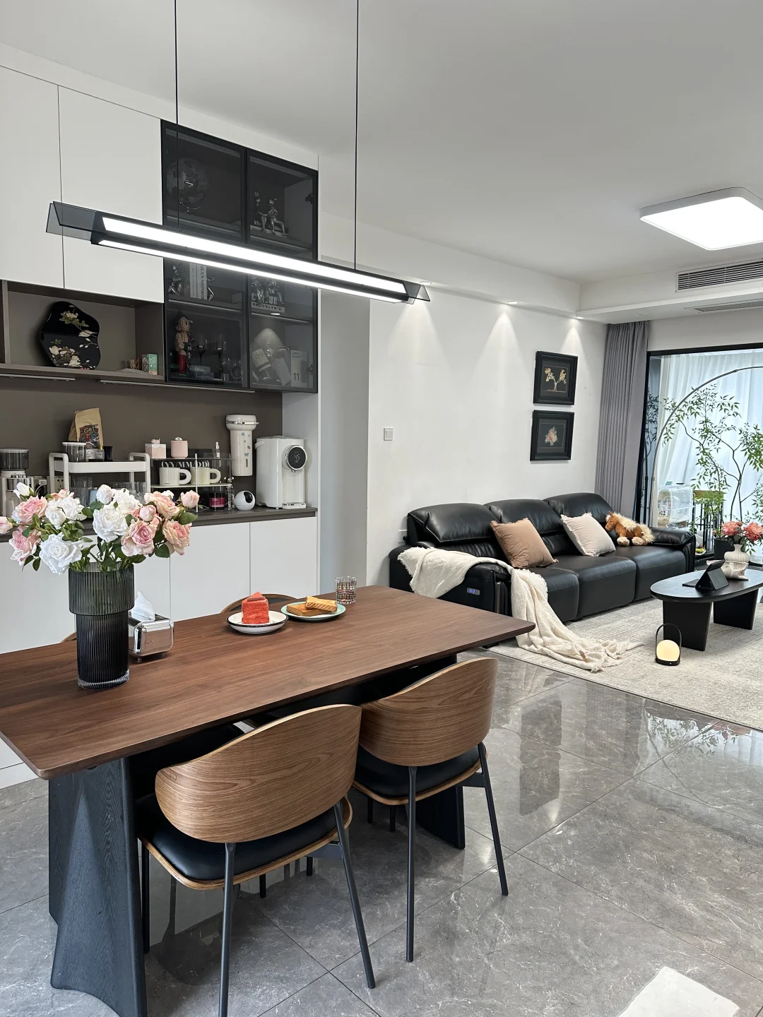 120平的精装房,90平套内 客餐厅一体,双阳台户型 四房两厅两卫,客厅开间3.6米,餐厅开间3米 没做复杂的背景墙,全靠软装支棱起来 入住两年还是干干净净的 在餐厅做个一个实用的满墙餐边柜,方便收纳 荷花白➕咖啡灰棕的配色简约又耐看 搭配胡桃木色的餐桌椅,让餐厅更温馨舒适 胡桃木桌面好打理还耐高温,真的很不错 低预算搭配的家,不算高级 但是我们一家四口的避风港❤️