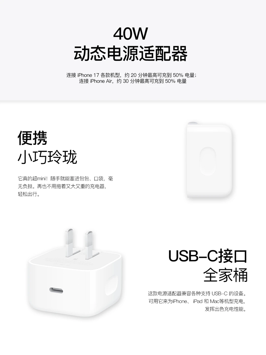 智能适配,自动配电:连接 iPhone 17 系列,20 分钟最高可充至 50%,刷几条短视频就能快速回血;连接 iPhone Air,30 分钟最高可充至 50%。接入 iPad,自动调节功率,稳定供电,无需手动切换,设备需多少电,就输出多少电量。