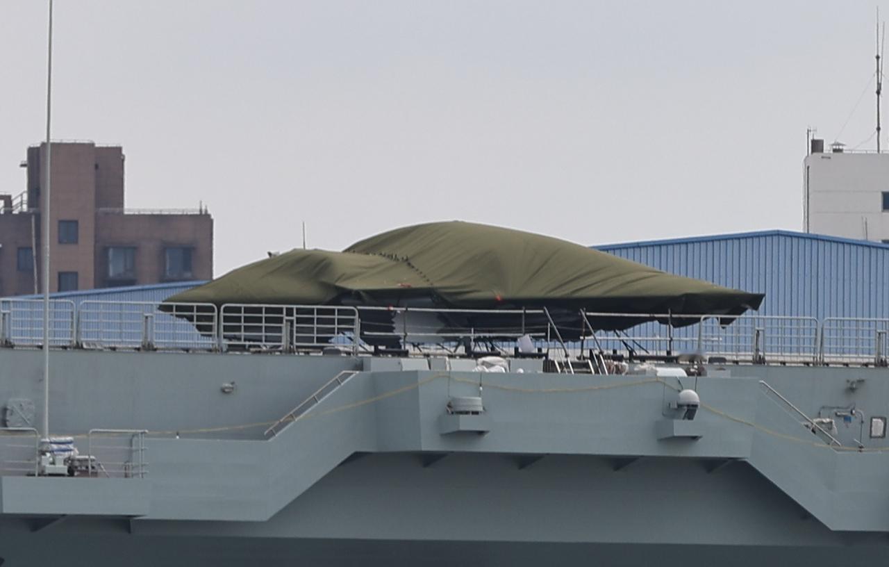 076两栖攻击舰飞行甲板上停放的粽子机,这架飞机被包裹的严严实实,什么也看不见。但是百密一疏,发现起落架舱门被露了出来,锯齿状的舱门可以初步判断,这是一架真机,不是用于甲板调度测试的模型机。很多大拿认为这是攻击二十一,但是仔细看这个粽子,发现机头侧面好像有鸭翼存在,所以到底这是什么型号只能待官宣弹射起飞的照片了。
