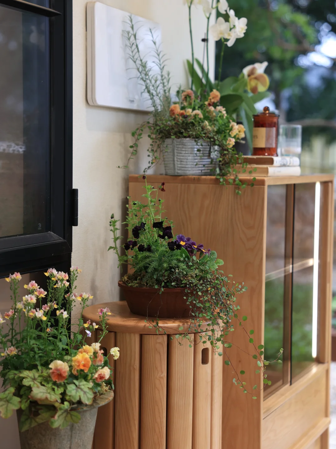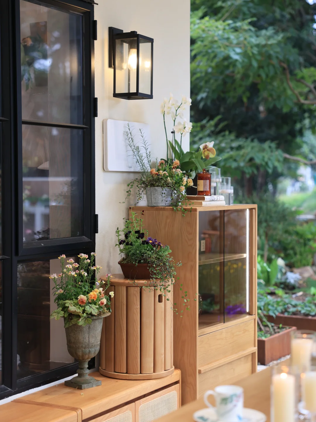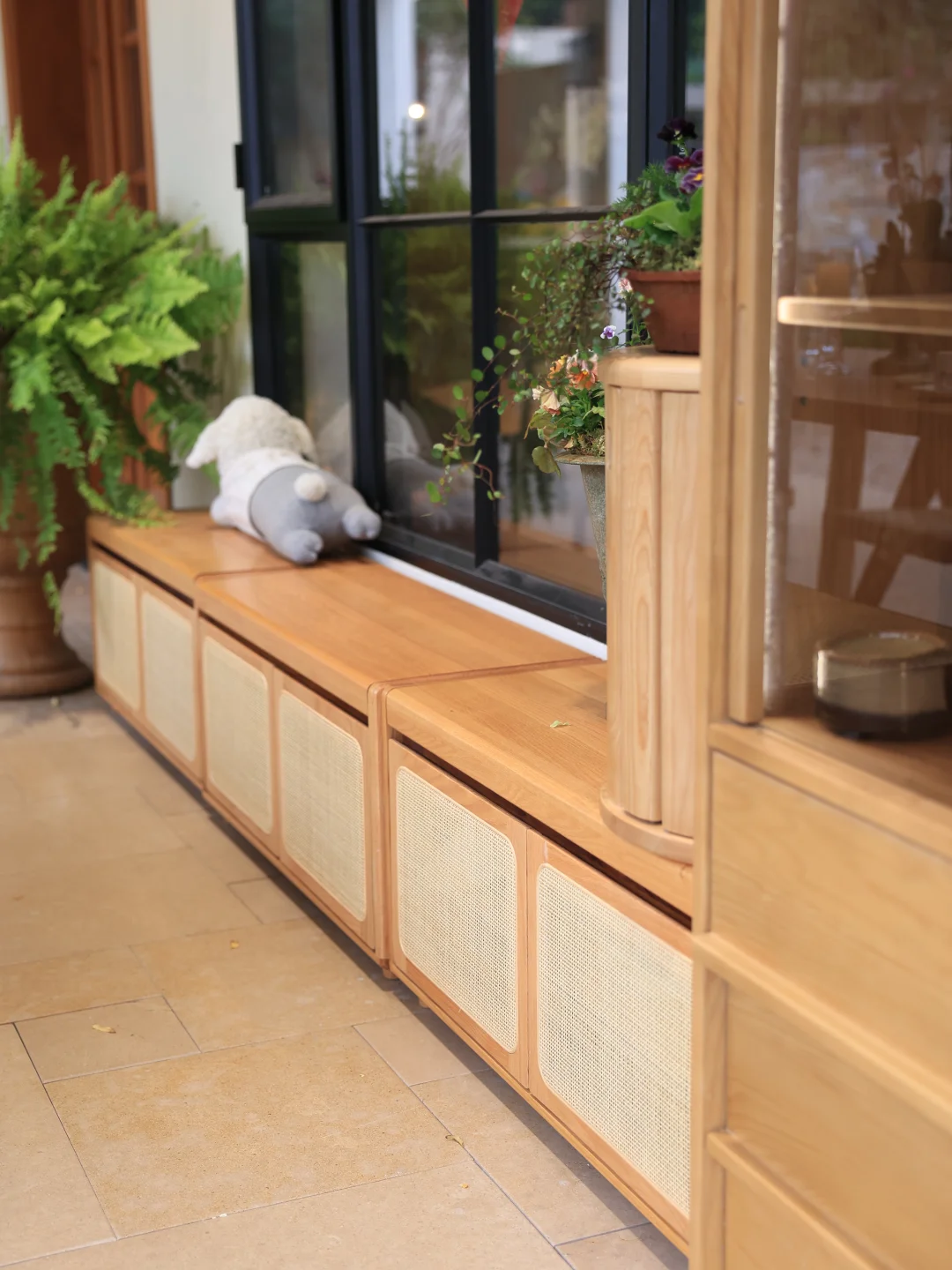 廊台被划分出不同功能区,靠近菜园的一侧,是喝茶、用餐、好友相聚的核心区域。入住后发现日常鞋子取放的痛点,精挑细选后入的矮柜恰合心意,一排三个,轻松收纳一家四口的日常鞋履,让空间整洁有序。