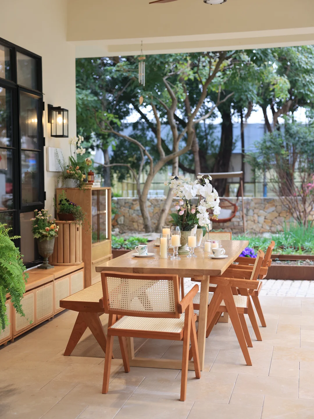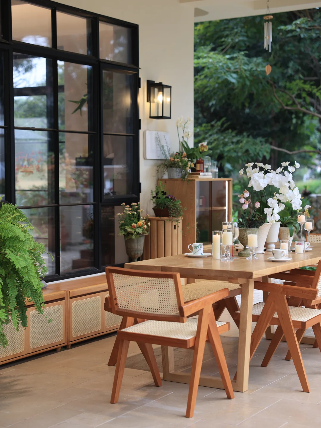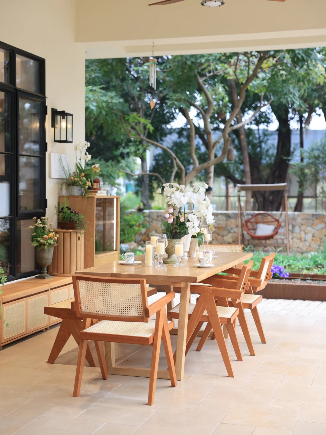 藤编座椅是这里的点睛之选,冬日坐感温润不冰,夏日透气不闷,四季使用都舒适。半户外的空间里,实木大桌更是省心,无惧天气影响,不会起鼓变形。始终偏爱原木质感的家具,耐看又经用,能在岁月里慢慢沉淀出生活的温度。