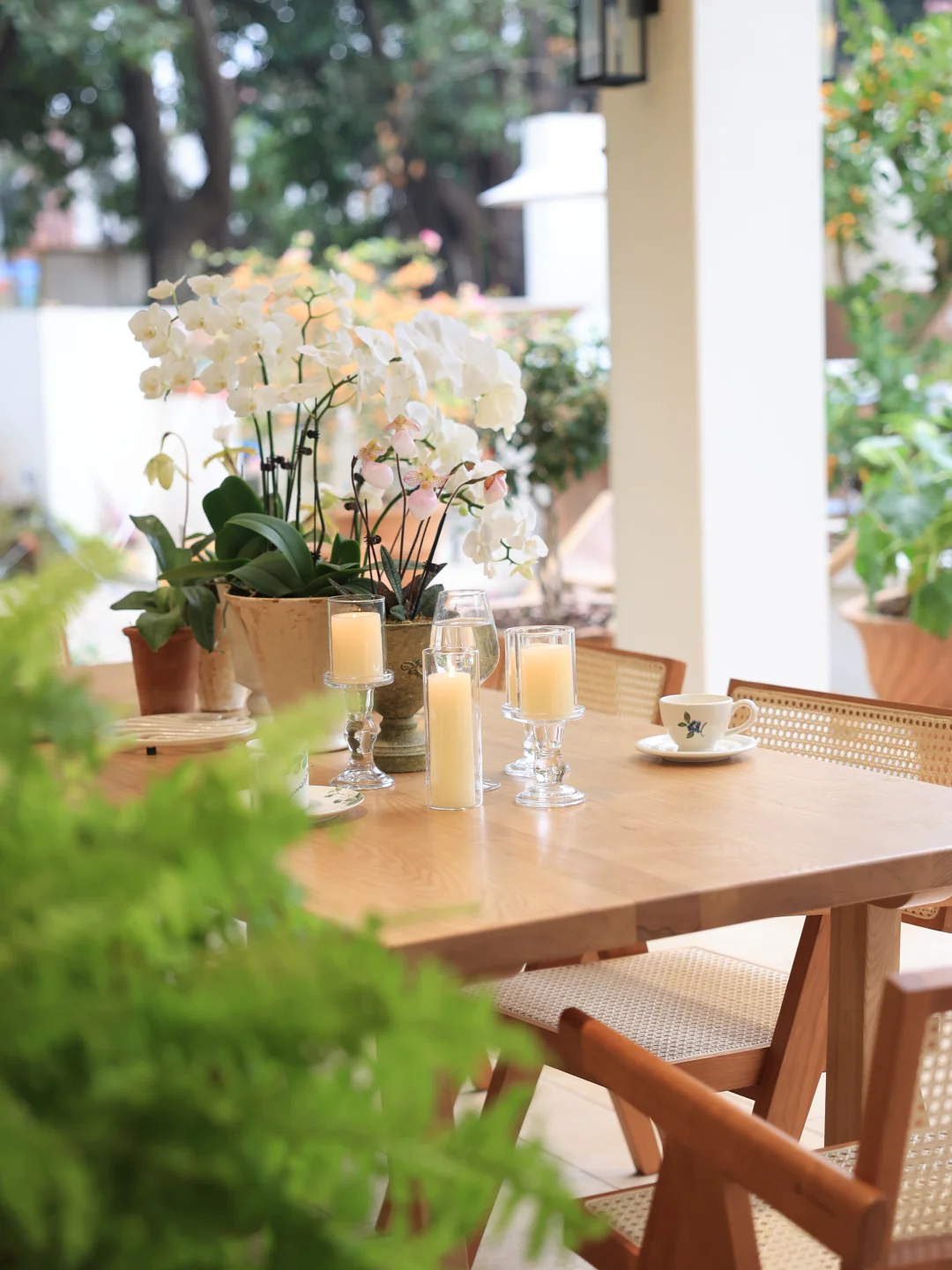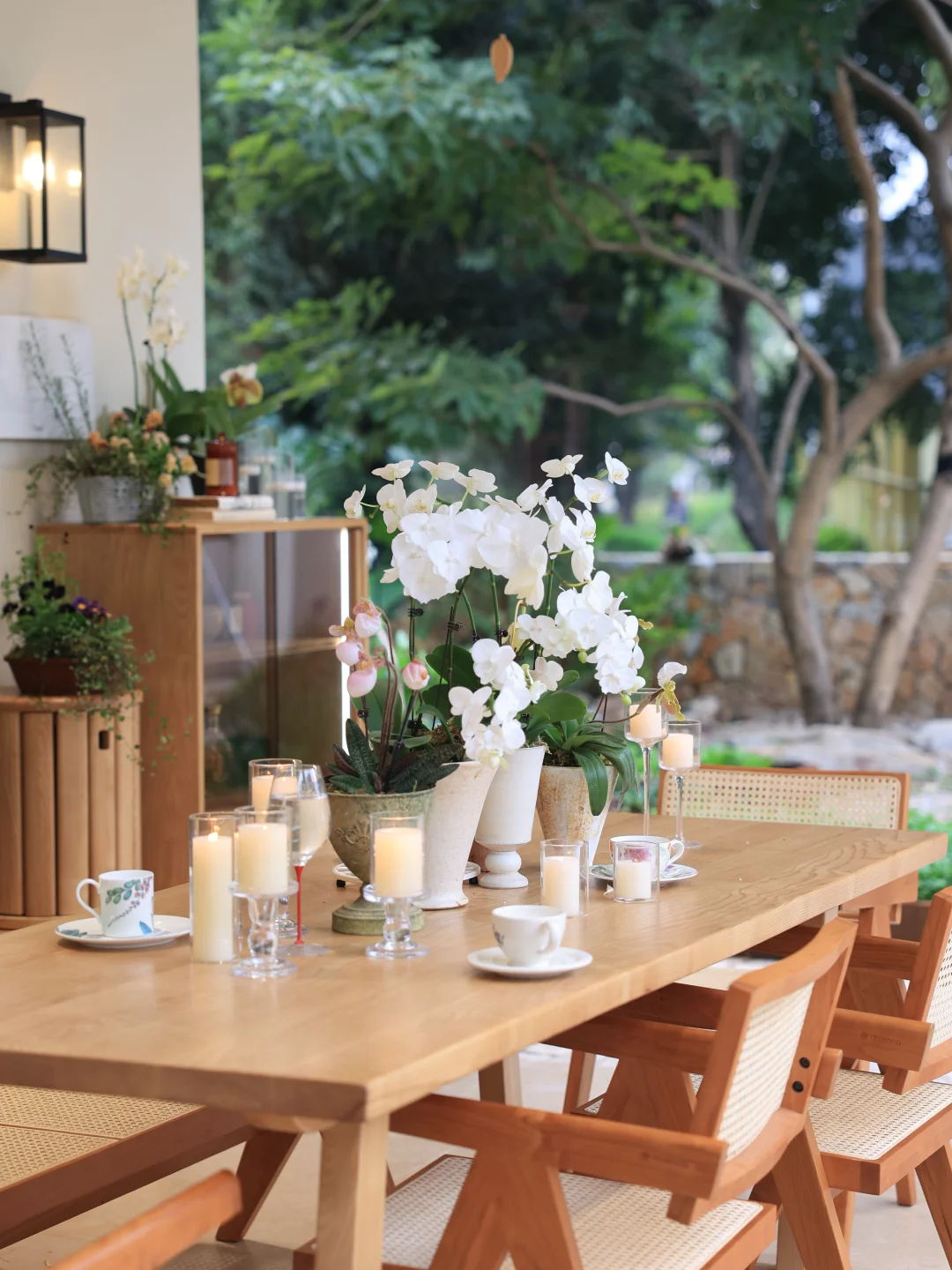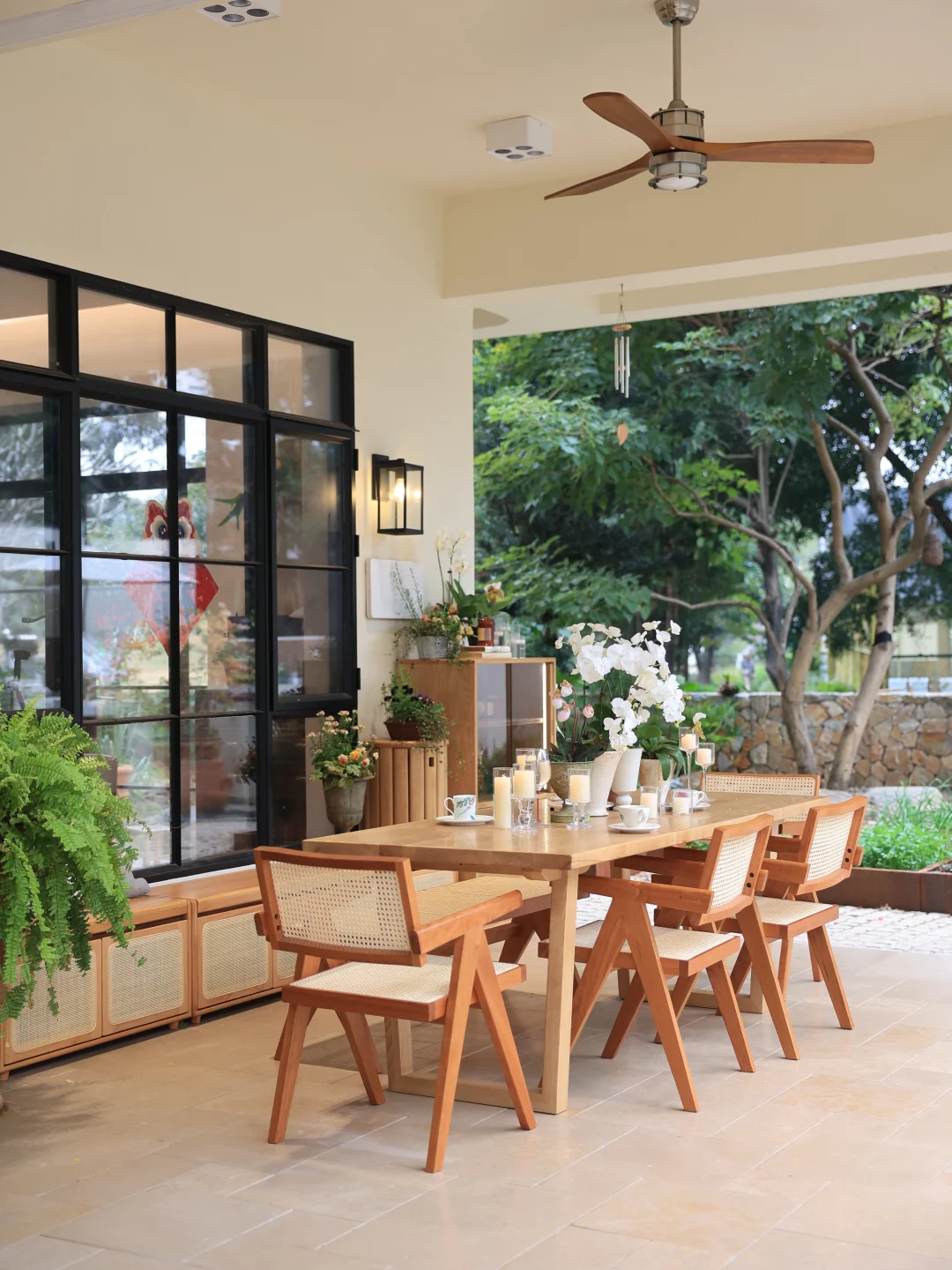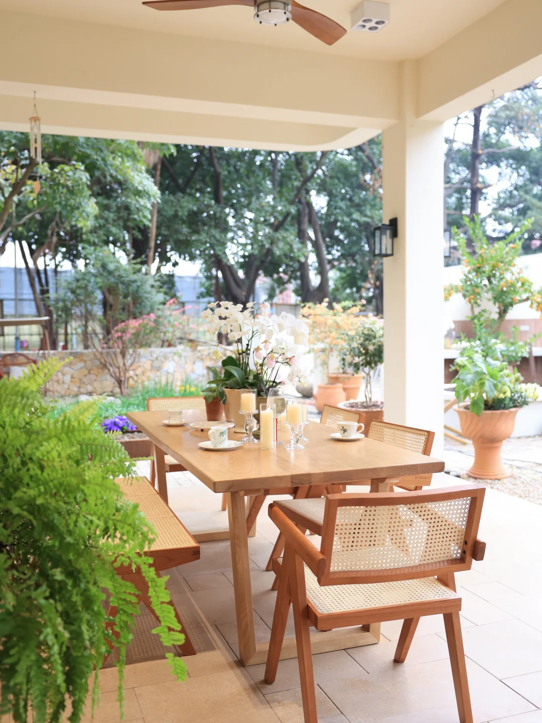 藤编座椅是这里的点睛之选,冬日坐感温润不冰,夏日透气不闷,四季使用都舒适。半户外的空间里,实木大桌更是省心,无惧天气影响,不会起鼓变形。始终偏爱原木质感的家具,耐看又经用,能在岁月里慢慢沉淀出生活的温度。