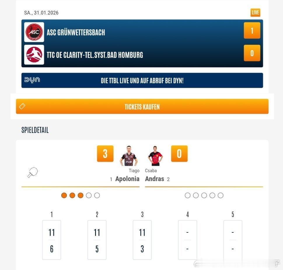阿波罗尼亚3比0安德拉斯(6,5,3)第二盘:贾维斯VS佩雷斯格伦韦特斯巴赫一比零巴特洪堡2025-2026赛季德甲乒乓球联赛第十五轮