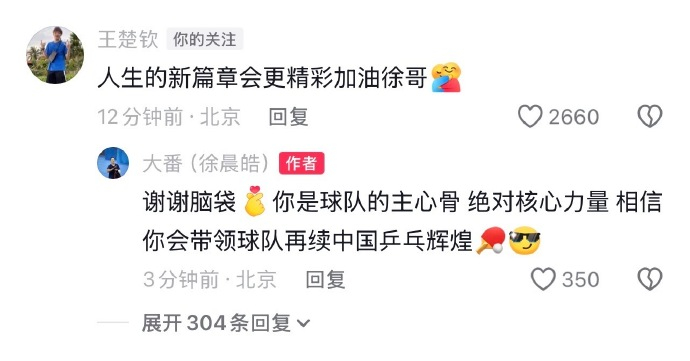 徐晨皓回复:谢谢脑袋你是球队的主心骨 绝对核心力量 相信你会带领球队再续中国乒乓辉煌🏓