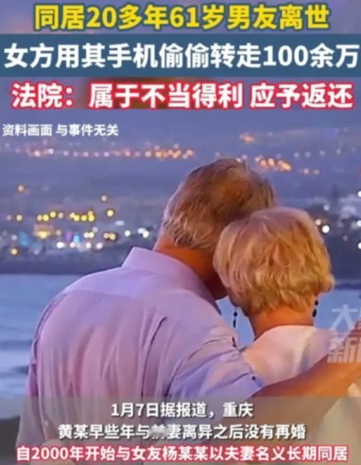 “白嫖了?”2022年,重庆一男子因病去世,同居女友杨某,第二天便用手机偷偷转走100余万,死者没有留下遗嘱,所以女儿和母亲是法定继承人,办完男子后事后,女儿发现上百万的大额转账记录,随即将杨某告上法庭,法院判了! 2022 年,重庆发生一起引发广泛热议的财产纠纷案件,男子黄山水因病突然离世,未留下任何遗嘱,其同居二十余年的女友杨某,在逝者去世次日,便通过手机银行私自将账户内 100 余万元存款转入自己名下。 事后,逝者女儿黄小芹与母亲整理账目时发现异常,随即提起诉讼,历经一审、二审,法院最终给出了明确判决。 黄山水早年与妻子离异,独自生活,后与杨某相识相恋,两人以夫妻名义共同生活近二十年,日常起居相互照料,还共同打理一间画廊,在外人眼中早已是一家人。 但这段稳定的陪伴,始终缺少民政部门颁发的结婚证,双方也未补办登记手续。 突发的疾病让黄山水来不及安排财产,也未留下书面遗赠文件,这为后续的纠纷埋下了伏笔。 杨某转走钱款后,面对黄小芹的追讨,始终拒绝退还,她主张自己与黄山水长期共同生活,付出了大量时间与精力,参与画廊经营、照料日常起居,即便没有结婚证,也构成事实婚姻,理应分得遗产。 为支撑诉求,杨某提交了经营票据、通讯记录、证人证言等材料,试图证明自己的共同经营贡献与生活付出。 黄小芹则认为,自己与祖母是父亲的法定第一顺序继承人,杨某与父亲仅为同居关系,不具备任何继承资格,私自转账属于非法占有,必须全额返还。 双方协商无果,黄小芹将杨某诉至法院。 法院审理查明,依据《民法典》及相关司法解释,1994 年 2 月 1 日之后未办理结婚登记的同居关系,均不认定为事实婚姻,无法享有配偶的法定继承权。 杨某与黄山水的同居起始时间在此节点之后,不属于合法夫妻,自然不在法定继承人范围内。 同时,杨某提交的证据,无法充分证实其对画廊存在共同出资、共同管理的实质贡献,法院未认定双方存在合伙经营关系。 此外,黄山水无有效遗嘱将财产赠与杨某,杨某擅自转账的行为,没有任何法律依据,已构成不当得利。 一审法院判决杨某向黄小芹返还全部 100 余万元款项,杨某不服提起上诉,二审法院经审理,认定一审事实清楚、适用法律正确,最终驳回上诉,维持原判。 长达二十年的情感陪伴,最终没能换来法律层面的财产分配资格,这场情与法的纷争,以严格遵循法律的结果尘埃落定。 这起案件清晰划出了情感关系与法律权利的边界,既有人情温度的考量,更有法律底线的坚守。 长期同居的付出值得理解,但法律对婚姻关系、继承资格的认定,始终以登记为核心标准,不会因同居时长、情感深浅而突破规则。 未领证的伴侣,无法自动获得继承权,即便存在照料付出,也只能依据《民法典》第一千一百三十一条,在符合 “扶养较多” 的前提下,主张适当分得遗产,而非直接占有全部存款。 私自转账的行为,本质是无视法定继承人权利、绕过法律程序的不当得利,即便初衷是认为 “理应所得”,也触碰了法律红线。 案件给大众带来明确警示:一是非婚同居不受婚姻法律保护,想要保障财产权益,应及时办理结婚登记,或订立合法遗嘱、签订财产协议;二是处理遗产必须尊重法定继承顺序,任何私自处分遗产的行为,都可能承担返还财产、赔偿损失的法律责任;三是若同居期间存在共同经营、共同出资,应提前留存合同、转账、记账等完整证据,避免纠纷时无法举证。 法律从不否定真挚的情感付出,但权利的主张必须于法有据,唯有提前做好法律规划,才能在意外来临时,既守护亲情与情谊,也避免不必要的纷争,让自身合法权益得到真正保障。
