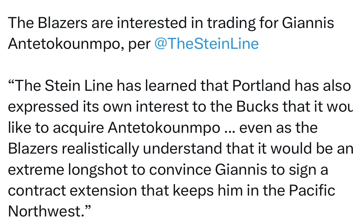 “开拓者已向雄鹿队表达了交易得到阿德托昆博的意向……尽管开拓者很清楚地意识到,说服扬尼斯与一支西北太平洋区的球队续约的可能性微乎其微。”
