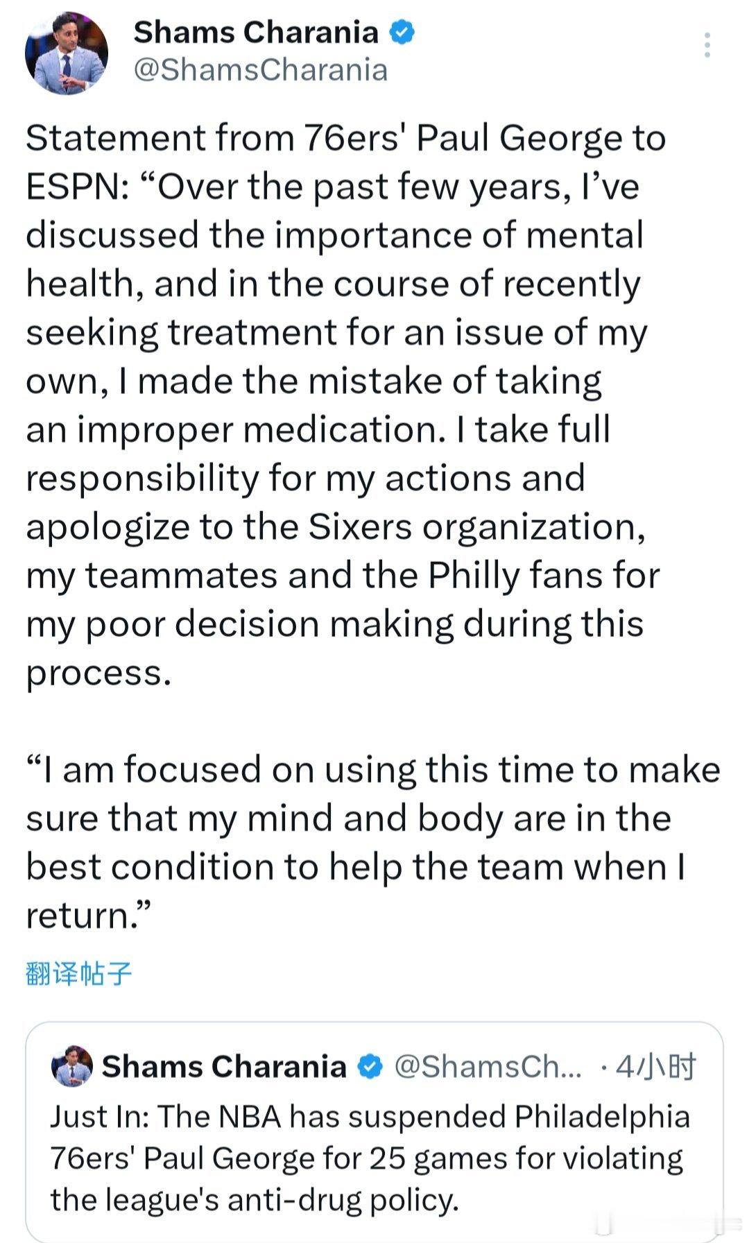 乔治发表声明道歉:过去几年,我一直在讨论心理健康的重要性。最近,我在寻求治疗自身心理健康问题的过程中,错误地服用了不当的药物。我愿为自己的行为承担全部责任,并就我在此过程中做出的错误决定向76人队、我的队友以及费城球迷道歉。