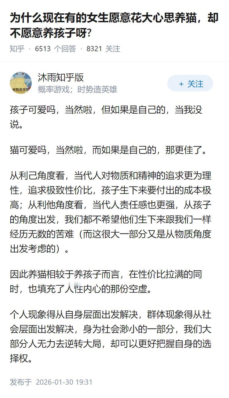 为什么现在有的女生愿意花大心思养猫,却不愿意养孩子呀?