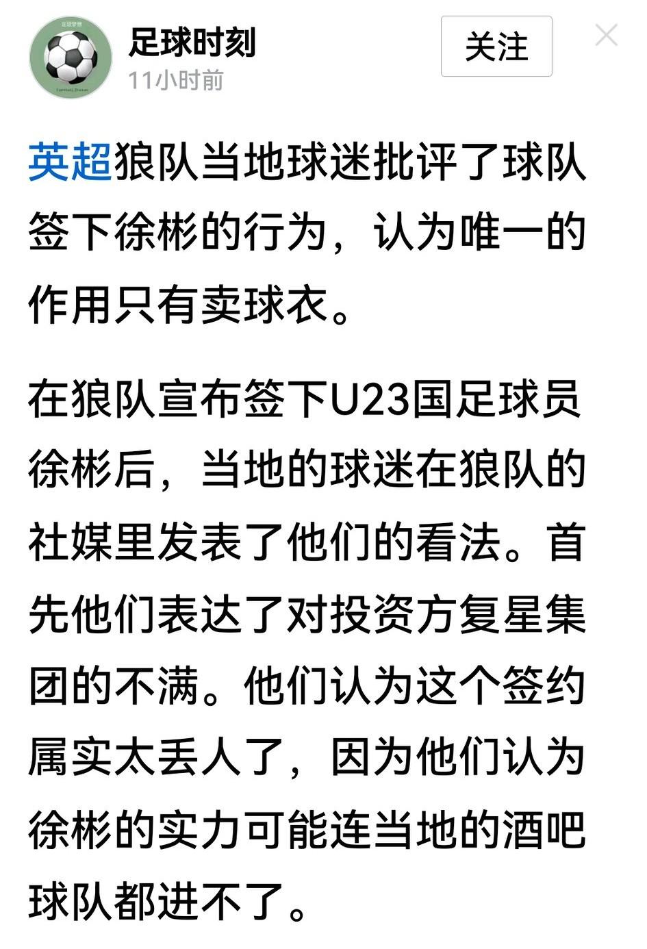徐彬加盟英超狼队进军五大联赛,让国内球迷狂喜,却让狼队球迷唏嘘,有极端者认为徐彬