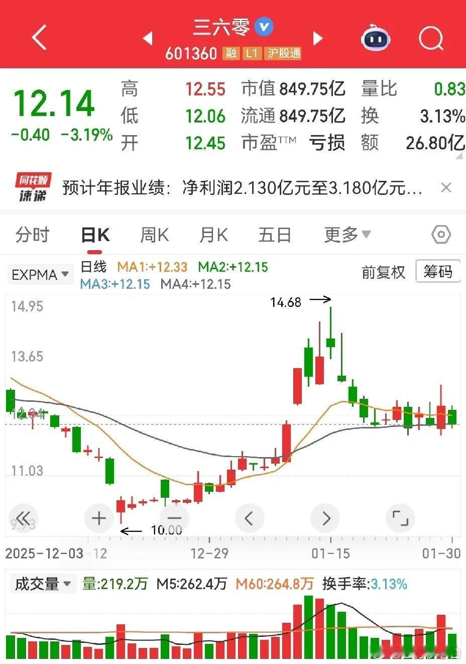 各位朋友,让我分析股票,你总是来看一下,留个言,相当于有个回音。我辛辛苦苦码字,不管码得整不整齐,好歹也算一种劳动付出,互相尊重一下,我也有点动力。这个三六零,我一直不怎么喜欢,搞个软件,里面好多弹窗,如果不会弄,电脑一开尽忙关闭无用软件,有好多是屡关不尽。有点广告可以理解,但是无休无止就不好了。看他这个走势,是在生命线处横盘,这种形态比较烦人,走也不是,留也不好,有个风吹草动也许就掉了下去。又不知道主力什么时候,能弹一下。看业绩预告,好像盈利了2到3亿元,但是扣非净利润只有0.27亿到0.4亿元,对于一个市值八百多亿的盘子,这点盈利聊胜于无。关键是,归属于母公司扣非净利润是-11.81亿元,完犊子了,真正的算是亏损的。你说他亏损吧,哎,他还有80亿资金去委托理财,奇怪不,哪来的钱,这样的公司你说他没有猫腻,我都不信。最后,只剩下题材概念了,虚幻的东西,也能使鸡毛飞上天。特别提醒:贴图欣赏,并非推荐,据此操作,风险自担。✦✦✦本人仅此一号,不主动加人,主动加人者是骗子。请提高警惕,否则损失自负。✦✦✦