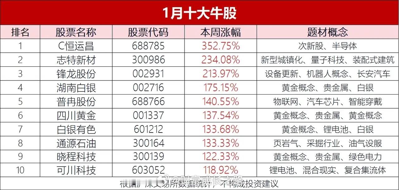 一月十大涨幅最大的股票,四个黄金白银股没有悬念,次新恒运昌涨幅榜首,普冉也上了榜我是没想到。