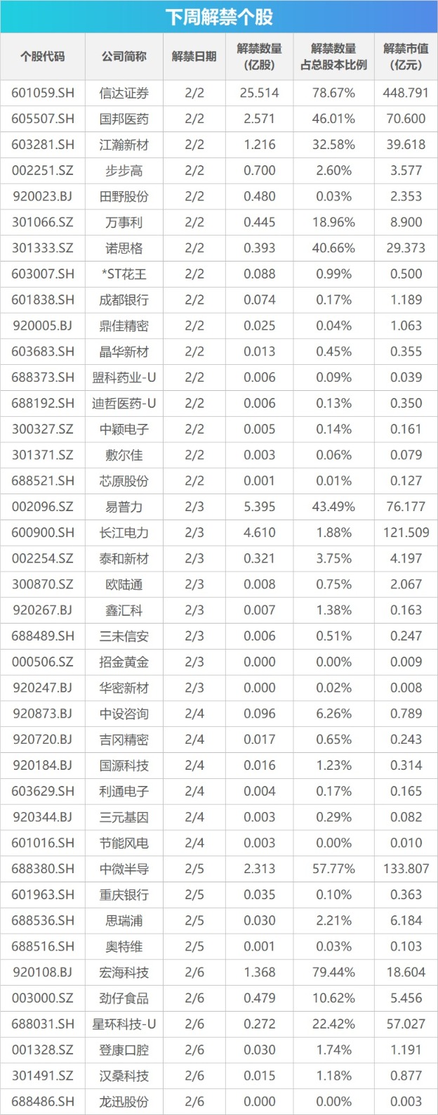 从解禁市值来看,2月2日是解禁高峰期,18家公司解禁市值合计607.1亿元,占下周解禁规模的58.56%。按1月30日收盘价计算,解禁市值居前三位的是:信达证券(448.79亿元)、中微半导(133.81亿元)、长江电力(121.51亿元)。从个股的解禁量看,解禁股数居前三位的是:信达证券(25.51亿股)、易普力(5.39亿股)、长江电力(4.61亿股)。