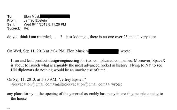 2013年12月马斯克计划前往小圣詹姆斯岛拜访爱泼斯坦的对话。2012年末的其中一封邮件中,马斯克曾向爱泼斯坦发问:"在我们的岛上,哪一天/晚上的派对最狂野?"