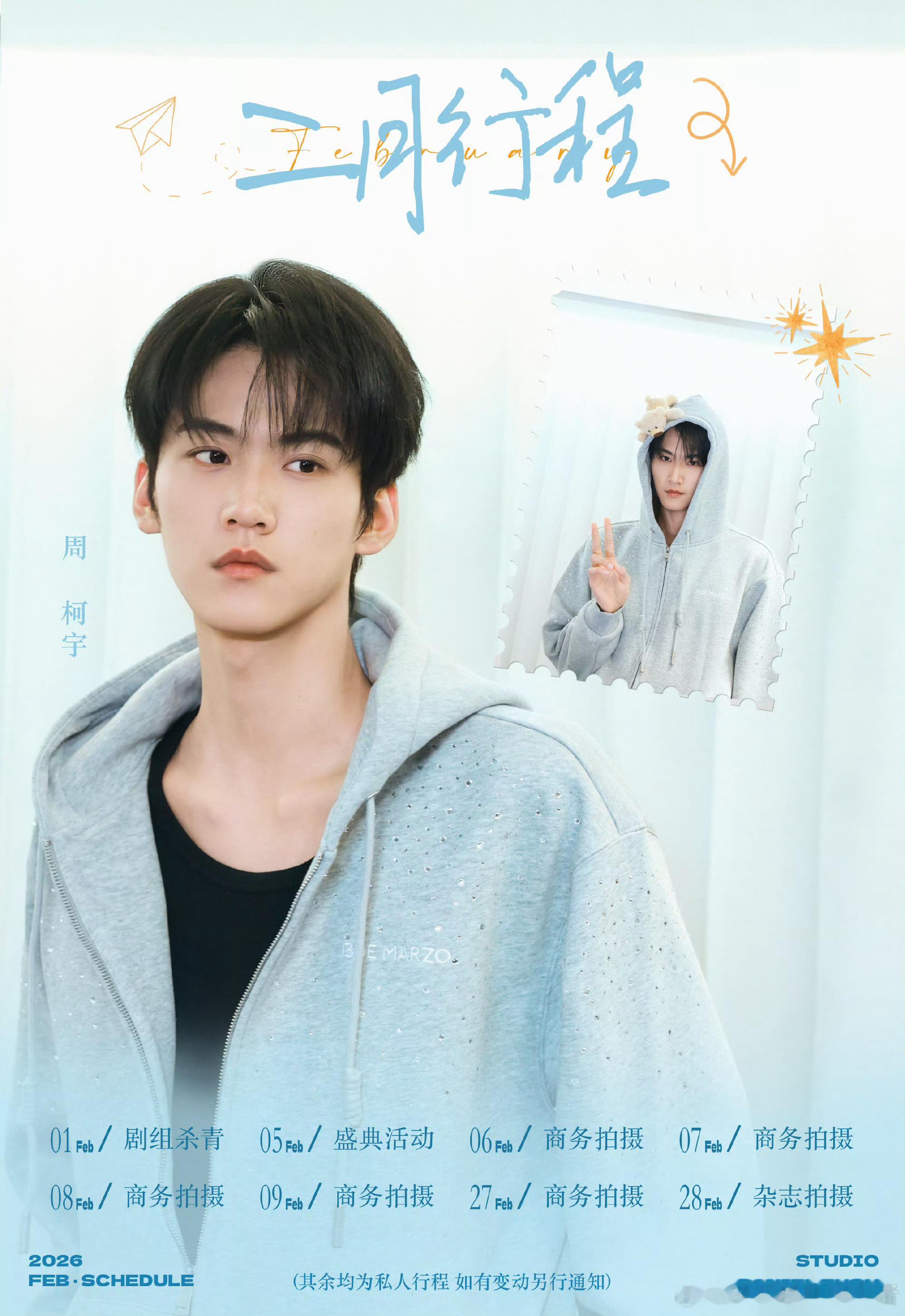 周柯宇二月行程图,满眼望去都是商务拍摄