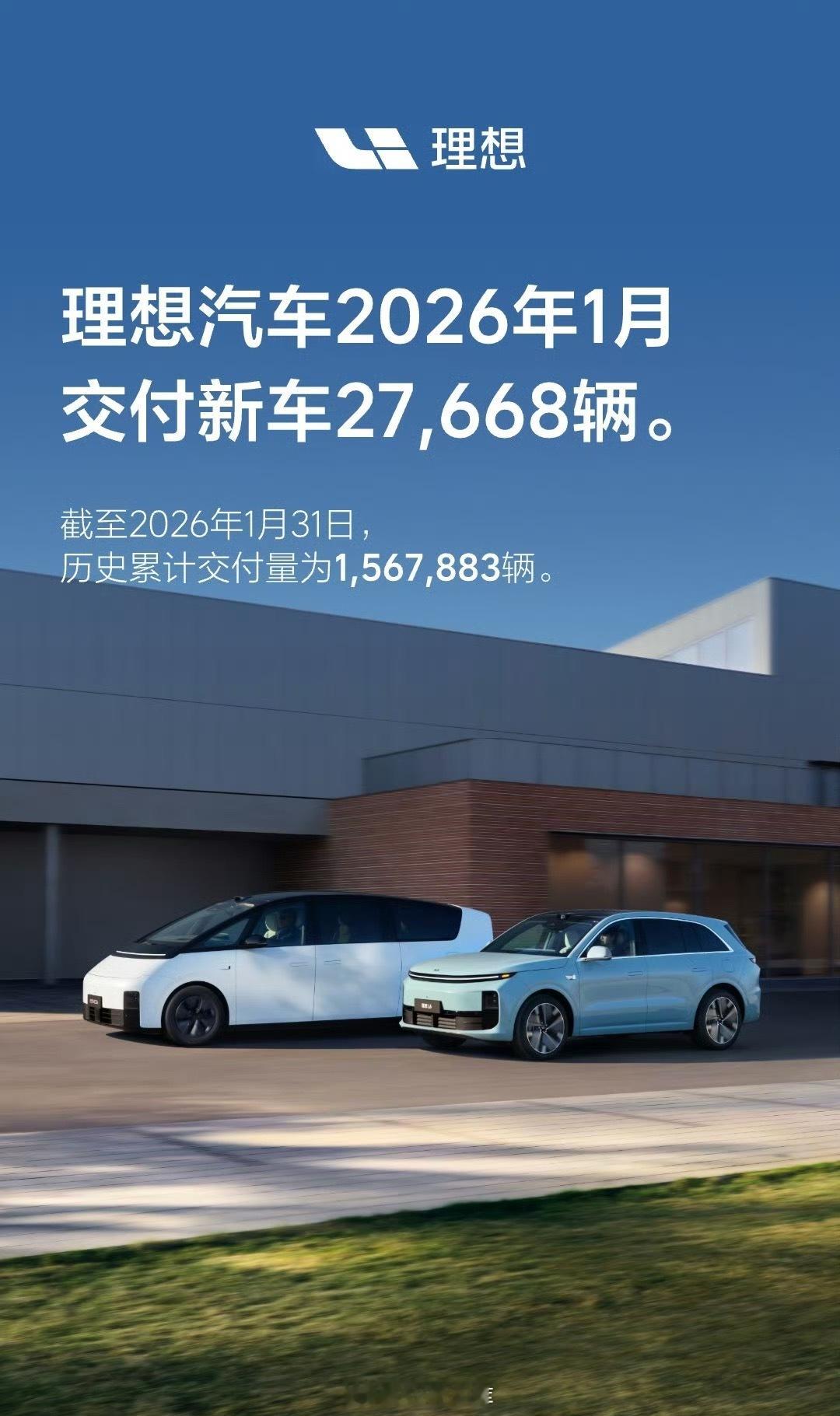理想汽车 1 月交付新车 27,668 辆,同比环比都有所下降。总交付量已经来到了 1,567,883 辆。