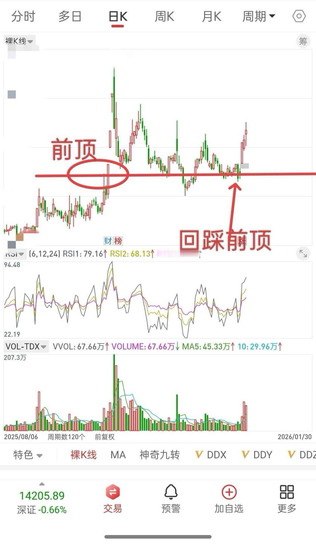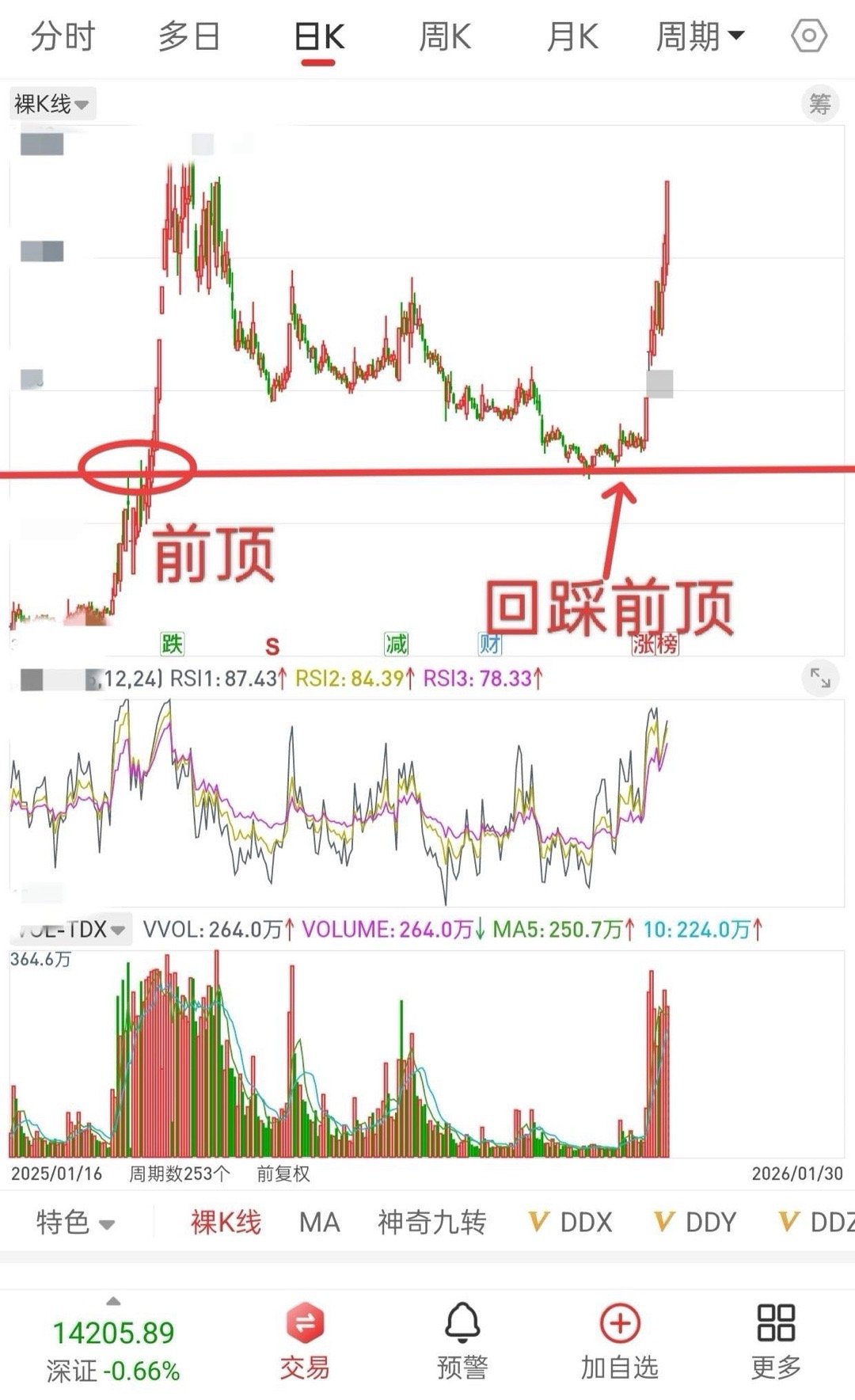 所以,前顶附近就是最佳上车点,同时前顶下方需带好小的防守,跌破前顶,小止损离场,没跌破等大肉。