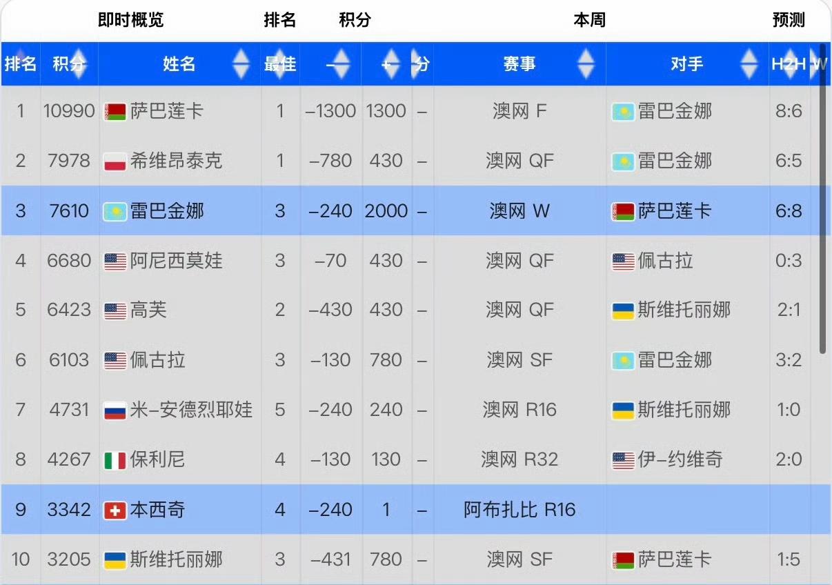 莱巴金娜澳网夺冠之路:1/4决赛2-0淘汰世界第二斯瓦泰克,半决赛2-0淘汰世界第六佩古拉,决赛2-1击败世界第一萨巴伦卡。 夺冠后不仅排名来到No.3,而且奖金非常丰厚。近三个月冰山美人变身千万富婆。 2025WTA年终冠军奖金523.5万美金,2026澳网冠军奖金415万澳元。