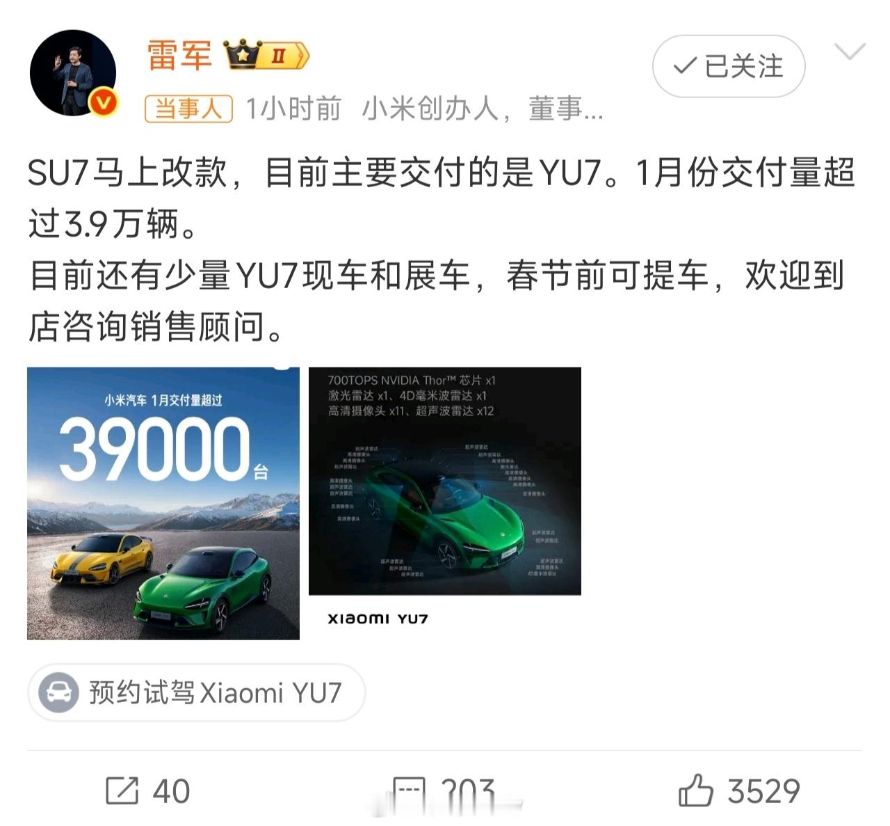 雷军回应小米汽车1月交付量很多人纳闷为什么小米汽车1月份的交付量不高,其实从下图可以看到SU7除了交付最后一波产线的产品,已经没有新的产量增加了,工厂已经开始全面建设新版SU7的产业链了。