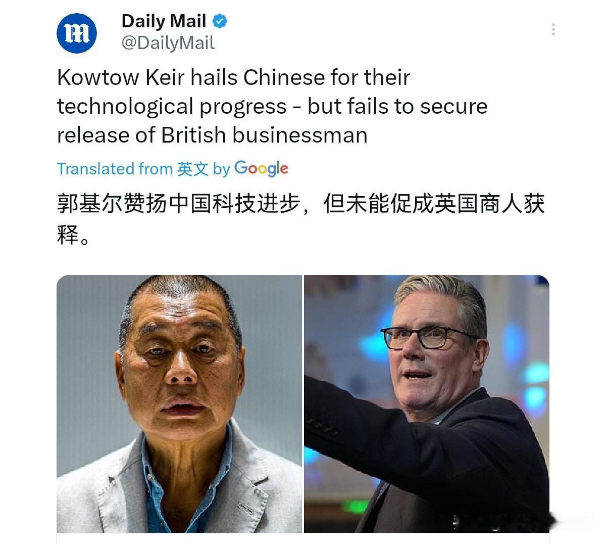滞留英国的“港独”分子破了大防!没有人在乎黎智英,英媒表示,首相斯塔默大赞中国科技进步,丝毫没有提及黎智英!2与1日,英国每日邮报刊文表示,斯塔默爵士昨晚冒着被指责“向中国低头”的风险,赞扬了中国科技变革的步伐,并感叹英国在基础设施建设方面进展太慢。不仅如此,他还建议,如果英国人学习中文,英国企业将会受益。 而至于黎智英,英媒称,黎智英的议题,在访华行程中似乎完全消失了。很显然,英媒报道的关于斯塔默的访华行程,这让“港独”非常的破防。这些“港独”分子希望斯塔默批评中国,对我们施压,但结果是什么呢?结果是与他们期待的完全相反。斯塔默不仅没有批评我们,反而感叹于中国的进步,也不提黎智英问题。 这样的现实摆在滞留在英国的“港独”分子面前,这可以说打了这些人一记响亮的耳光。黎智英勾结外部势力,祸乱香港,但现在黎智英面对的就是被彻底抛弃的命运。作为前“宗主国”,这些人心心念念把英国当作“靠山”,但英国无疑务实的意识到中国的内政,英国不应该干涉,抱着“港独”这种毫无价值的棋子与我们作对,只会让英国错失发展机遇。 这些滞留英国的“港独”分子,一边寄人篱下靠抹黑祖国讨取西方反华势力的一点残羹冷炙,一边做着“靠外部分裂中国”的黄粱美梦,以为自己是西方反华势力的“座上宾”,殊不知在别人眼里,他们不过是工具人。有用,则摆弄一番,吆喝几声,无用,则扔在一边。很显然,面对中英关系的改善,这些人如丧考妣。